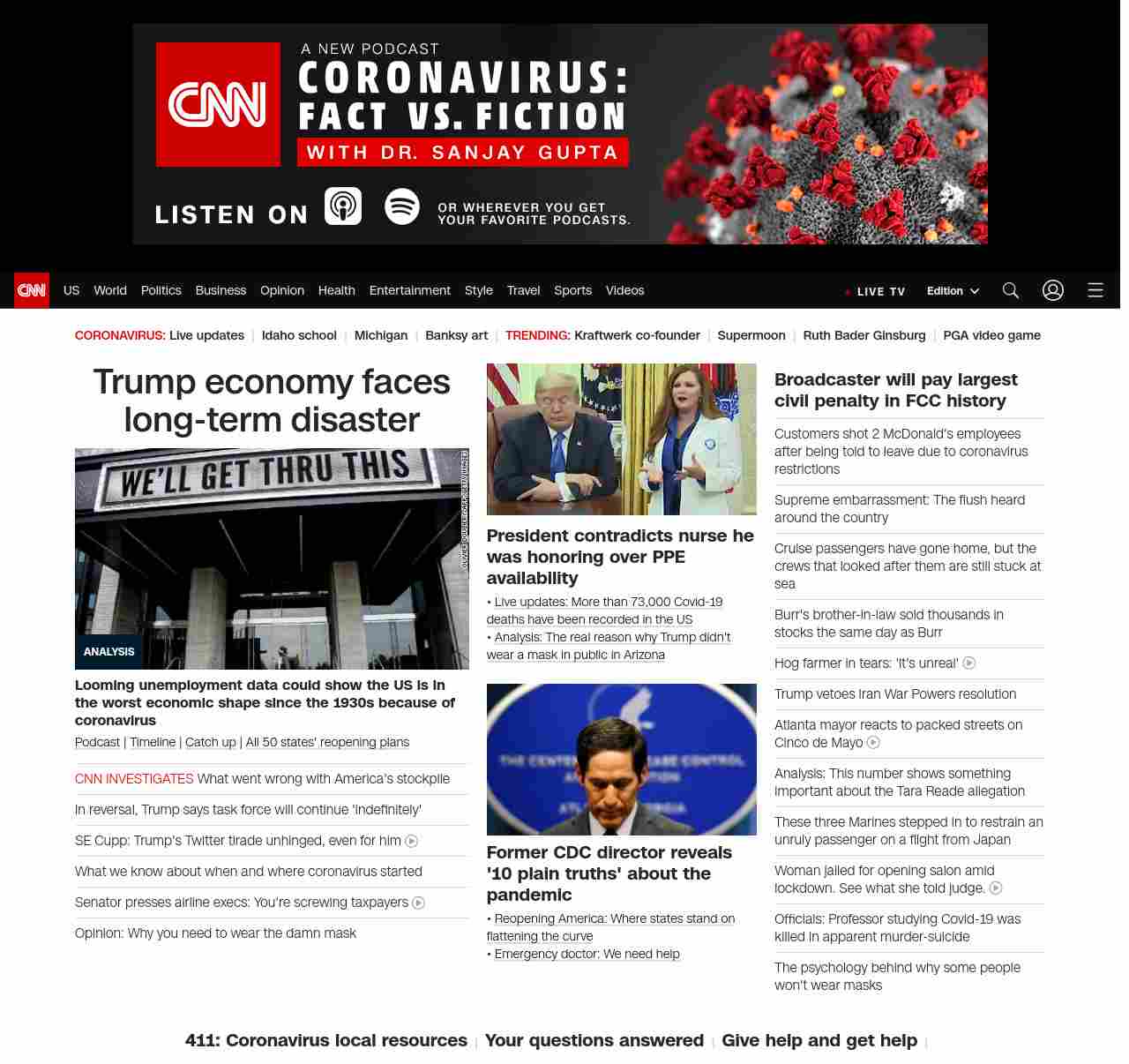 || screaming-banner-text banner-text-size–char-41″ data-analytics=”_list-hierarchical-xs_article_”> Trump economy faces long-term disaster ||” , title: “CNN – Breaking News, Latest News and Videos” , siblings: {“articleList”:[{“uri”:”/2020/05/07/politics/donald-trump-coronavirus-economy/index.html”,”headline”:”u003cstrong>Looming unemployment data could show the US is in the worst economic shape since the 1930s because of coronavirusu003c/strong>”,”thumbnail”:”//cdn.cnn.com/cnnnext/dam/assets/200506205742-07-april-jobs-report-2020-restricted-small-11.jpg”,”duration”:””,”description”:”u003ca href=”https://www.cnn.com/audio/podcasts/corona-virus” target=”_blank”>Podcastu003c/a> | u003ca href=”https://www.cnn.com/interactive/2020/health/covid19-pandemic-video-timeline/index.html” target=”_blank”>Timelineu003c/a> | u003ca href=”https://www.cnn.com/2020/05/06/world/coronavirus-newsletter-05-06-20-intl/index.html” target=”_blank”>Catch upu003c/a> | u003ca href=”https://www.cnn.com/interactive/2020/us/states-reopen-coronavirus-trnd/” target=”_blank”>All 50 states’ reopening plansu003c/a>”,”layout”:””