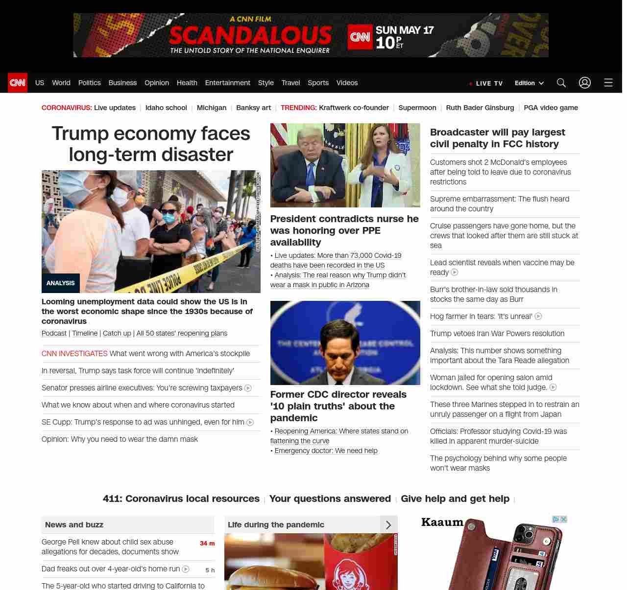 || screaming-banner-text banner-text-size–char-41″ data-analytics=”_list-hierarchical-xs_article_”> Trump economy faces long-term disaster ||” , title: “CNN – Breaking News, Latest News and Videos” , siblings: {“articleList”:[{“uri”:”/2020/05/07/politics/donald-trump-coronavirus-economy/index.html”,”headline”:”u003cstrong>Looming unemployment data could show the US is in the worst economic shape since the 1930s because of coronavirusu003c/strong>”,”thumbnail”:”//cdn.cnn.com/cnnnext/dam/assets/200506210953-11-april-jobs-report-2020-small-11.jpg”,”duration”:””,”description”:”u003ca href=”https://www.cnn.com/audio/podcasts/corona-virus” target=”_blank”>Podcastu003c/a> | u003ca href=”https://www.cnn.com/interactive/2020/health/covid19-pandemic-video-timeline/index.html” target=”_blank”>Timelineu003c/a> | u003ca href=”https://www.cnn.com/2020/05/06/world/coronavirus-newsletter-05-06-20-intl/index.html” target=”_blank”>Catch upu003c/a> | u003ca href=”https://www.cnn.com/interactive/2020/us/states-reopen-coronavirus-trnd/” target=”_blank”>All 50 states’ reopening plansu003c/a>”,”layout”:””