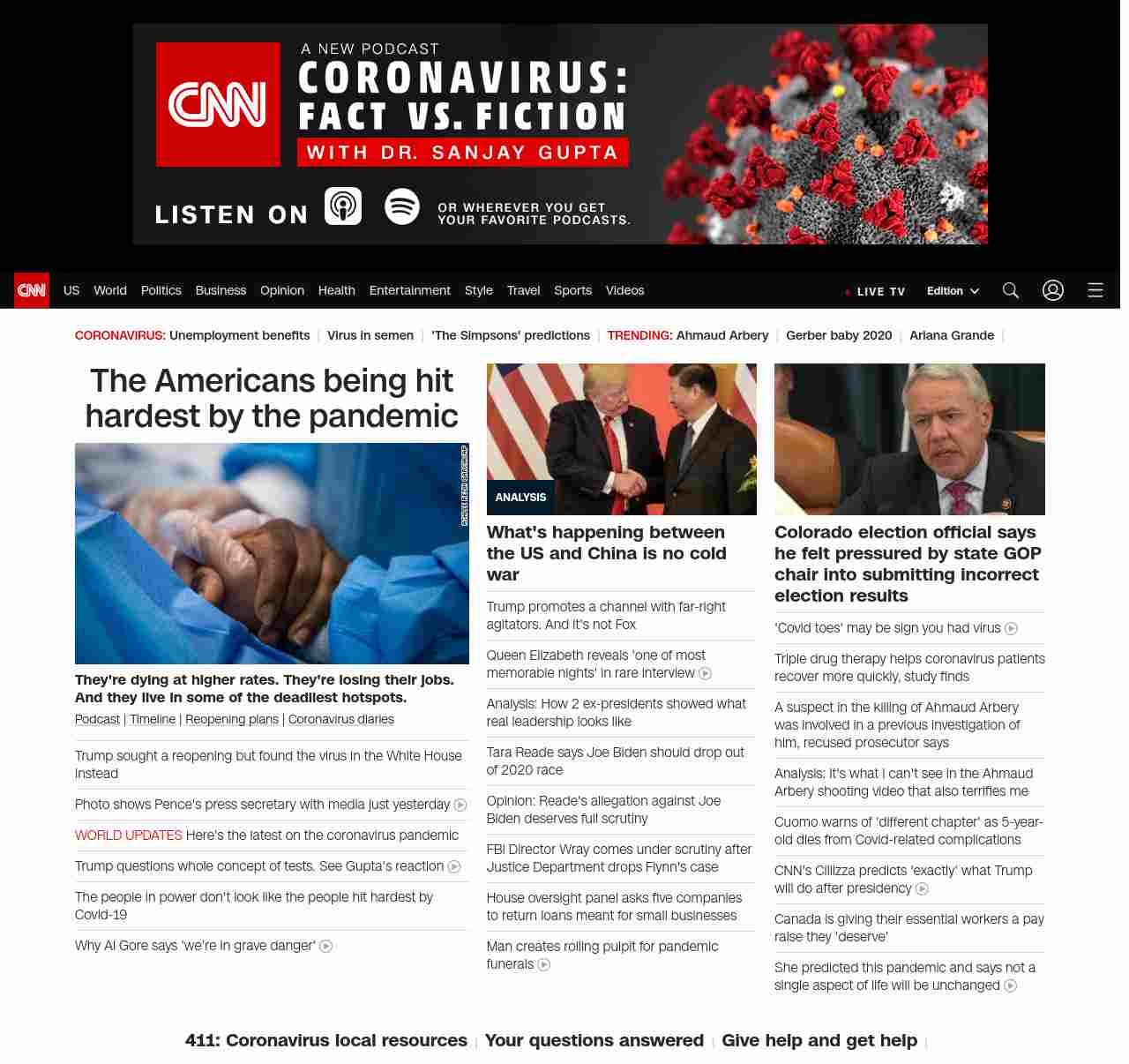 || screaming-banner-text banner-text-size–char-47″ data-analytics=”_list-hierarchical-xs_article_”> The Americans being hit hardest by the pandemic ||” , title: “CNN – Breaking News, Latest News and Videos” , siblings: {“articleList”:[{“uri”:”/2020/05/08/us/coronavirus-pandemic-race-impact-trnd/index.html”,”headline”:”u003cstrong>They’re dying at higher rates. They’re losing their jobs. And they live in some of the deadliest hotspots.u003c/strong>”,”thumbnail”:”//cdn.cnn.com/cnnnext/dam/assets/200508203513-coronavirus-patient-chicago-0428-small-11.jpg”,”duration”:””,”description”:”u003ca href=”https://www.cnn.com/audio/podcasts/corona-virus” target=”_blank”>Podcastu003c/a> | u003ca href=”https://www.cnn.com/interactive/2020/health/covid19-pandemic-video-timeline/index.html” target=”_blank”>Timelineu003c/a> | u003ca href=”https://www.cnn.com/interactive/2020/us/states-reopen-coronavirus-trnd/” target=”_blank”>Reopening plansu003c/a> | u003ca href=”https://www.cnn.com/specials/world/coronavirus-diaries” target=”_blank”>Coronavirus diariesu003c/a>”,”layout”:””