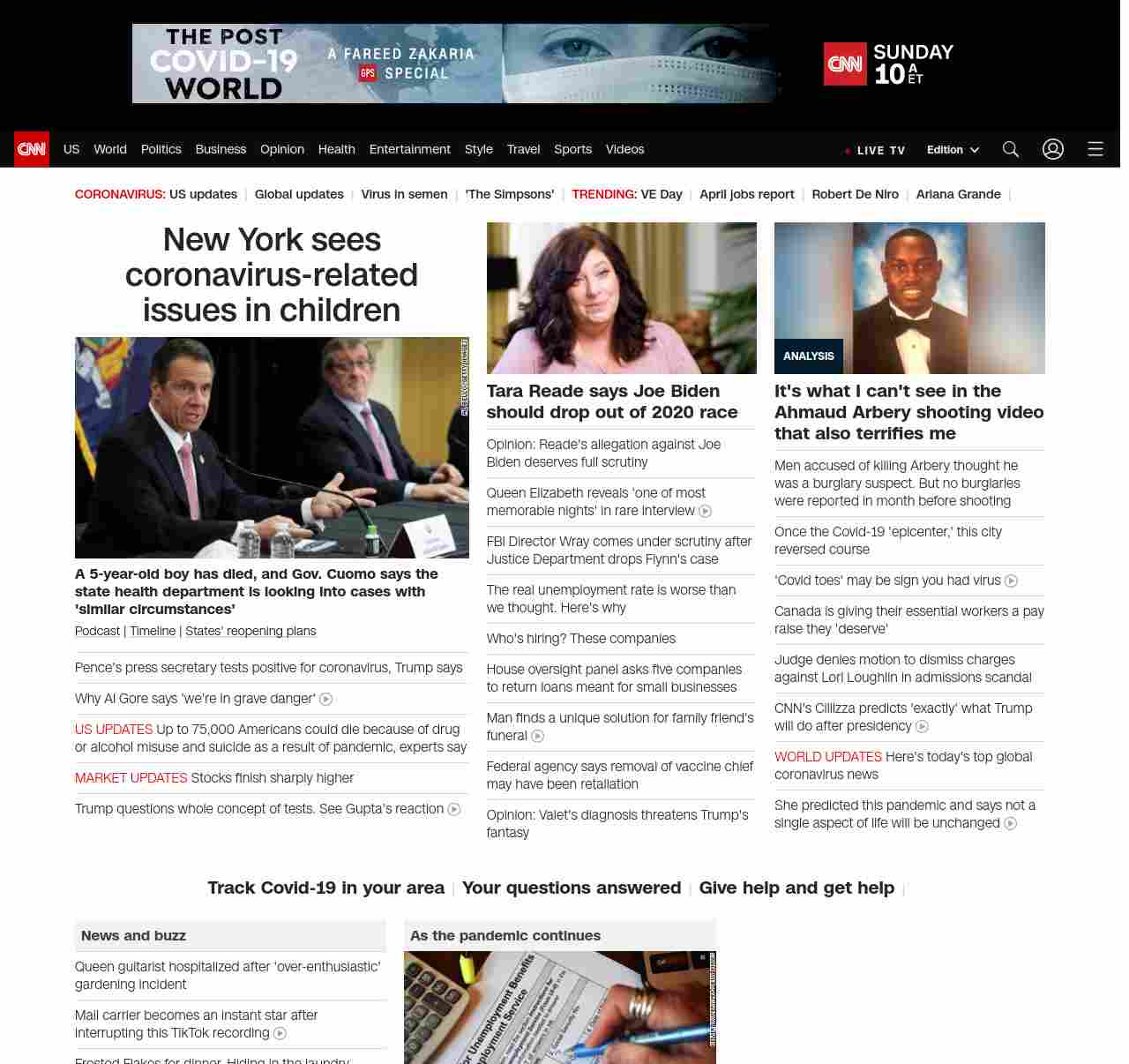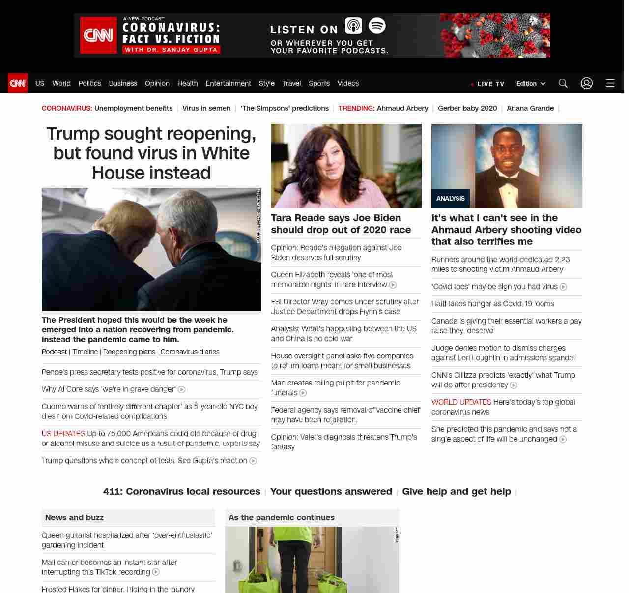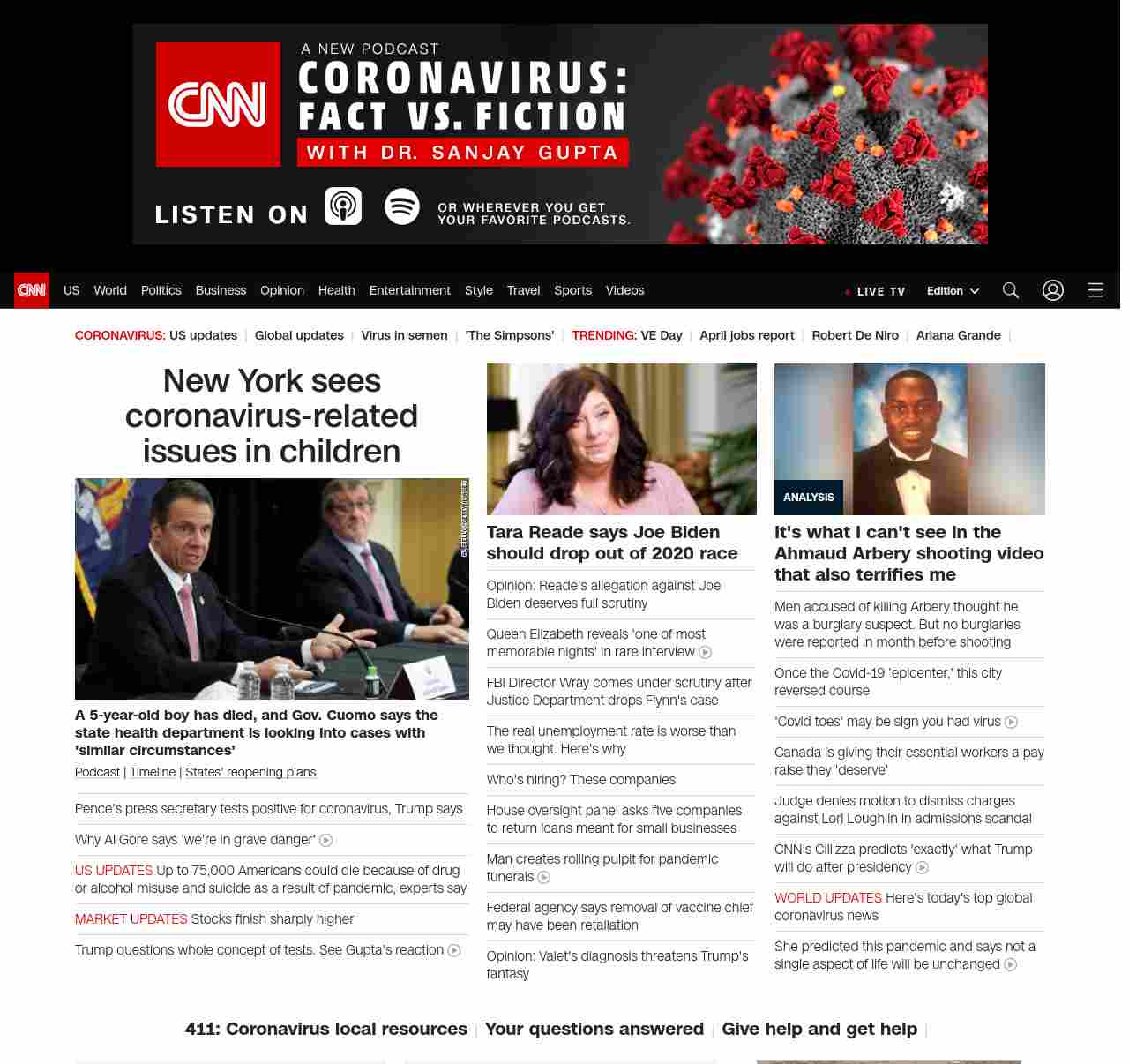 || screaming-banner-text banner-text-size–char-47″ data-analytics=”_list-hierarchical-xs_hyperlink_”> Pence’s press secretary tests positive for coronavirus ||” , title: “CNN – Breaking News, Latest News and Videos” , siblings: {“articleList”:[{“uri”:”/2020/05/08/us/cuomo-child-nyc-dies-coronavirus-trnd/index.html”,”headline”:”u003cstrong>A 5-year-old boy has died, and Gov. Cuomo says the state health department is looking into cases with ‘similar circumstances’u003c/strong>”,”thumbnail”:”//cdn.cnn.com/cnnnext/dam/assets/200508130315-cuomo-press-conf-trnd-small-11.jpg”,”duration”:””,”description”:”u003ca href=”https://www.cnn.com/audio/podcasts/corona-virus” target=”_blank”>Podcastu003c/a> | u003ca href=”https://www.cnn.com/interactive/2020/health/covid19-pandemic-video-timeline/index.html” target=”_blank”>Timelineu003c/a> | u003ca href=”https://www.cnn.com/interactive/2020/us/states-reopen-coronavirus-trnd/” target=”_blank”>States’ reopening plansu003c/a>”,”layout”:””