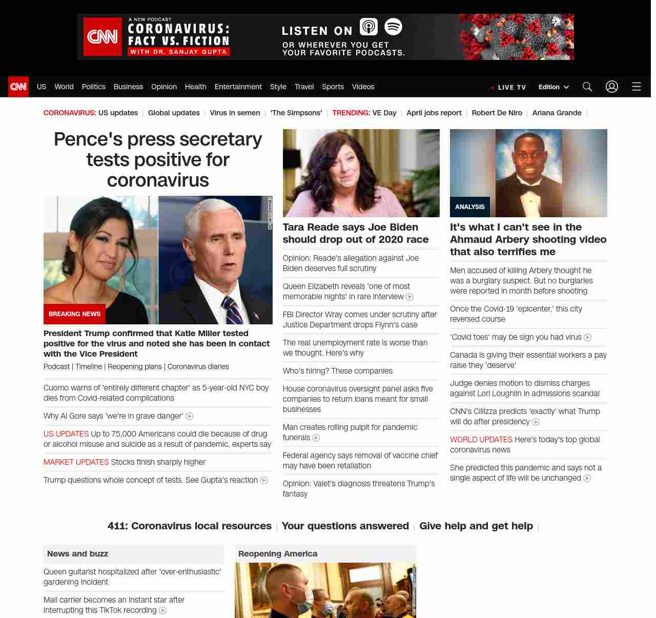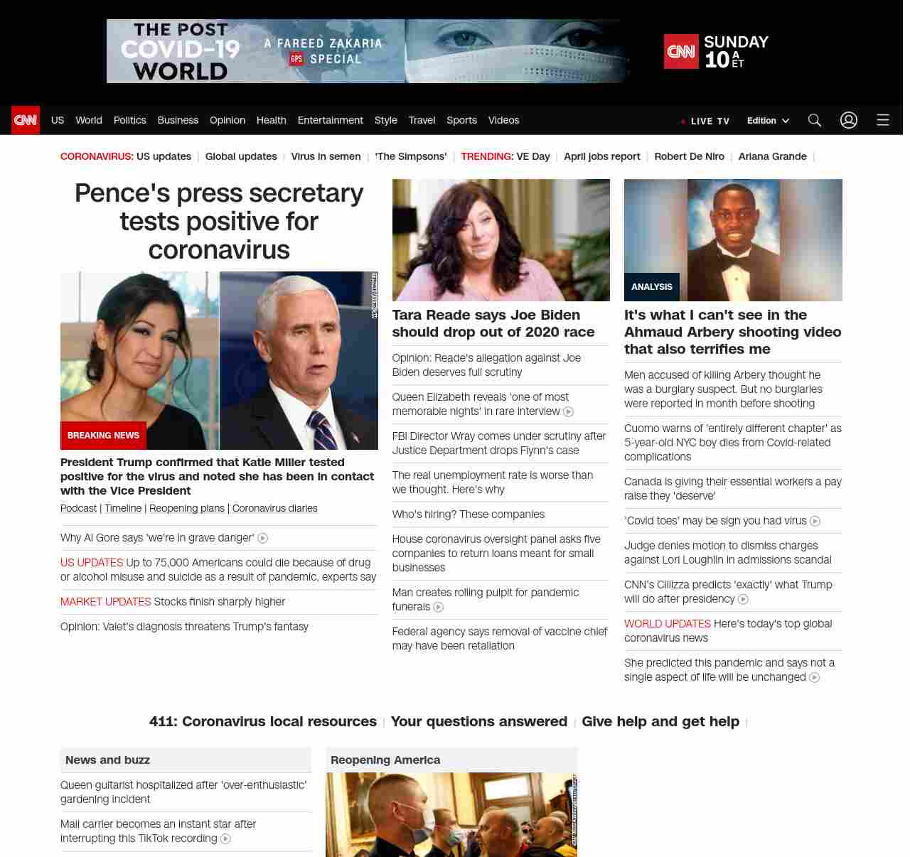 || screaming-banner-text banner-text-size–char-47″ data-analytics=”_list-hierarchical-xs_hyperlink_”> Pence’s press secretary tests positive for coronavirus ||” , title: “CNN – Breaking News, Latest News and Videos” , siblings: {“articleList”:[{“uri”:”/2020/05/08/us/cuomo-child-nyc-dies-coronavirus-trnd/index.html”,”headline”:”Cuomo warns of ‘entirely different chapter’ as 5-year-old NYC boy dies from Covid-related complications”,”thumbnail”:”//cdn.cnn.com/cnnnext/dam/assets/200508130315-cuomo-press-conf-trnd-small-11.jpg”,”duration”:””,”description”:”For months, parents have been counting their blessings amid reports that the novel coronavirus generally seemed to u003ca href=”https://www.cnn.com/2020/03/11/health/coronavirus-children-sick/index.html” target=”_blank”>spare childrenu003c/a>. “,”layout”:””