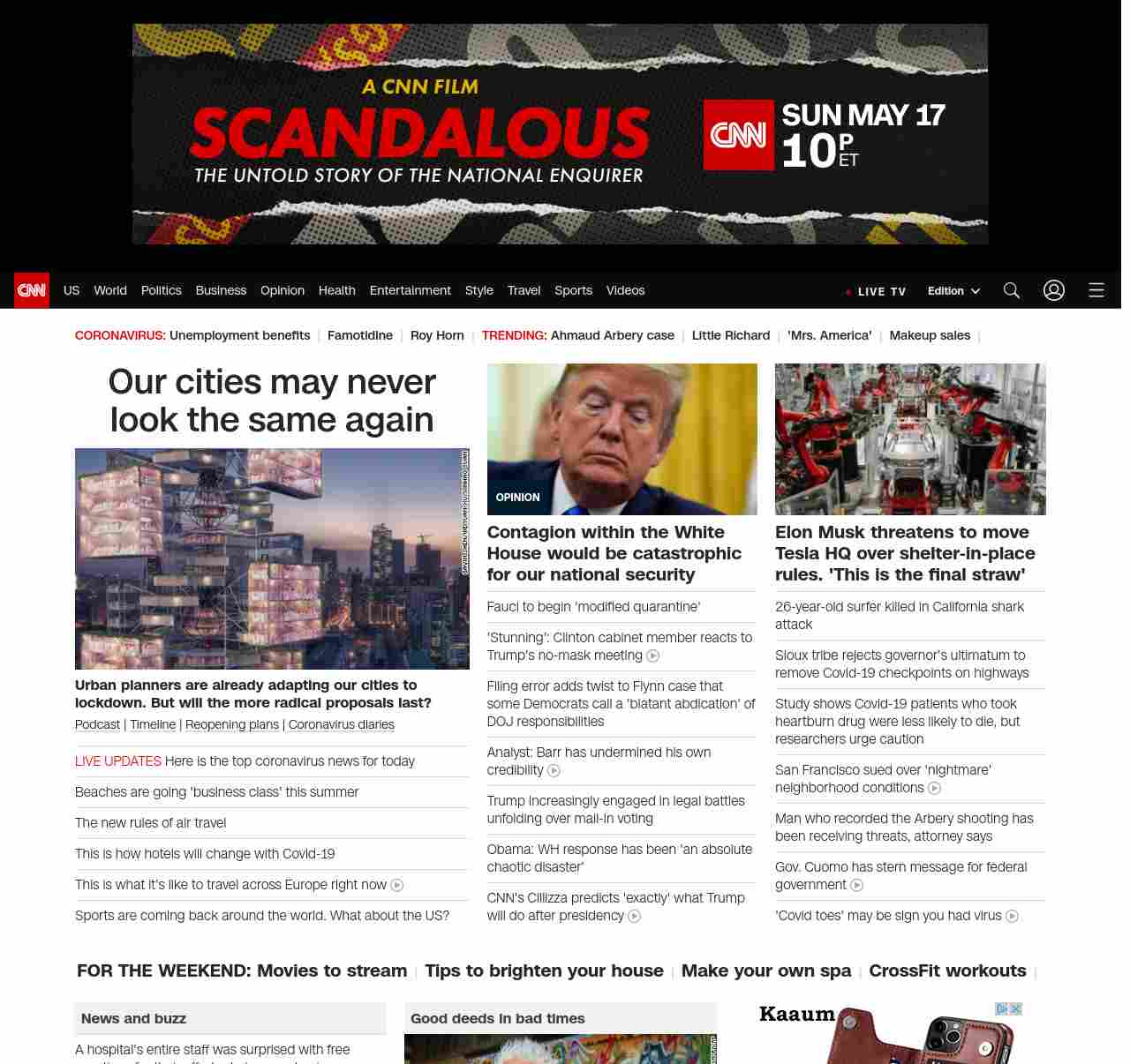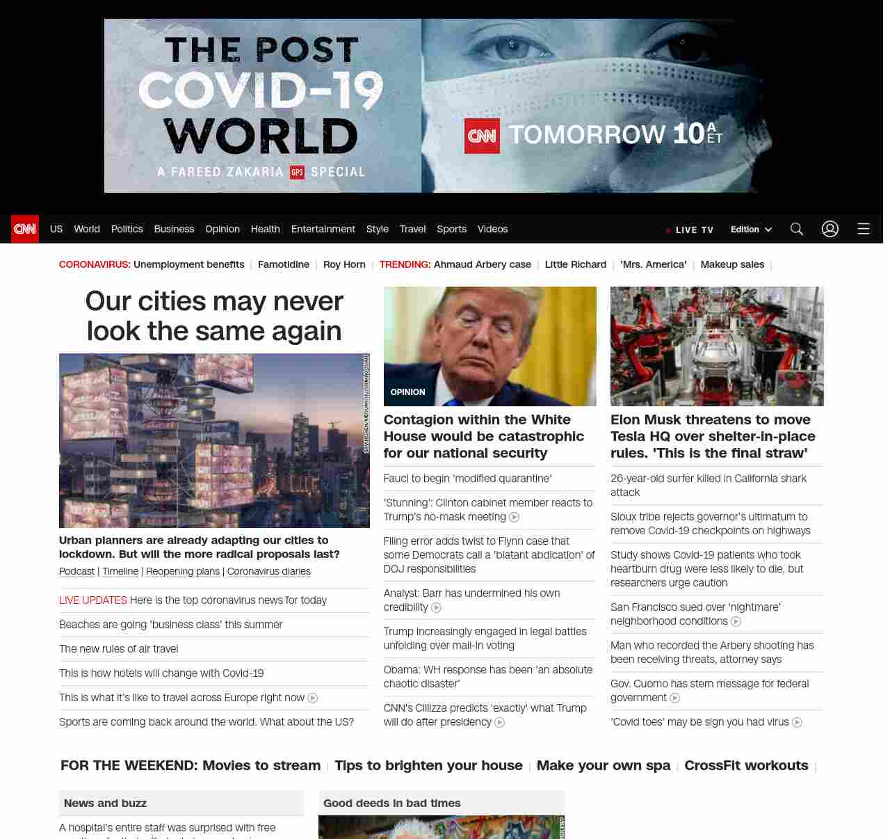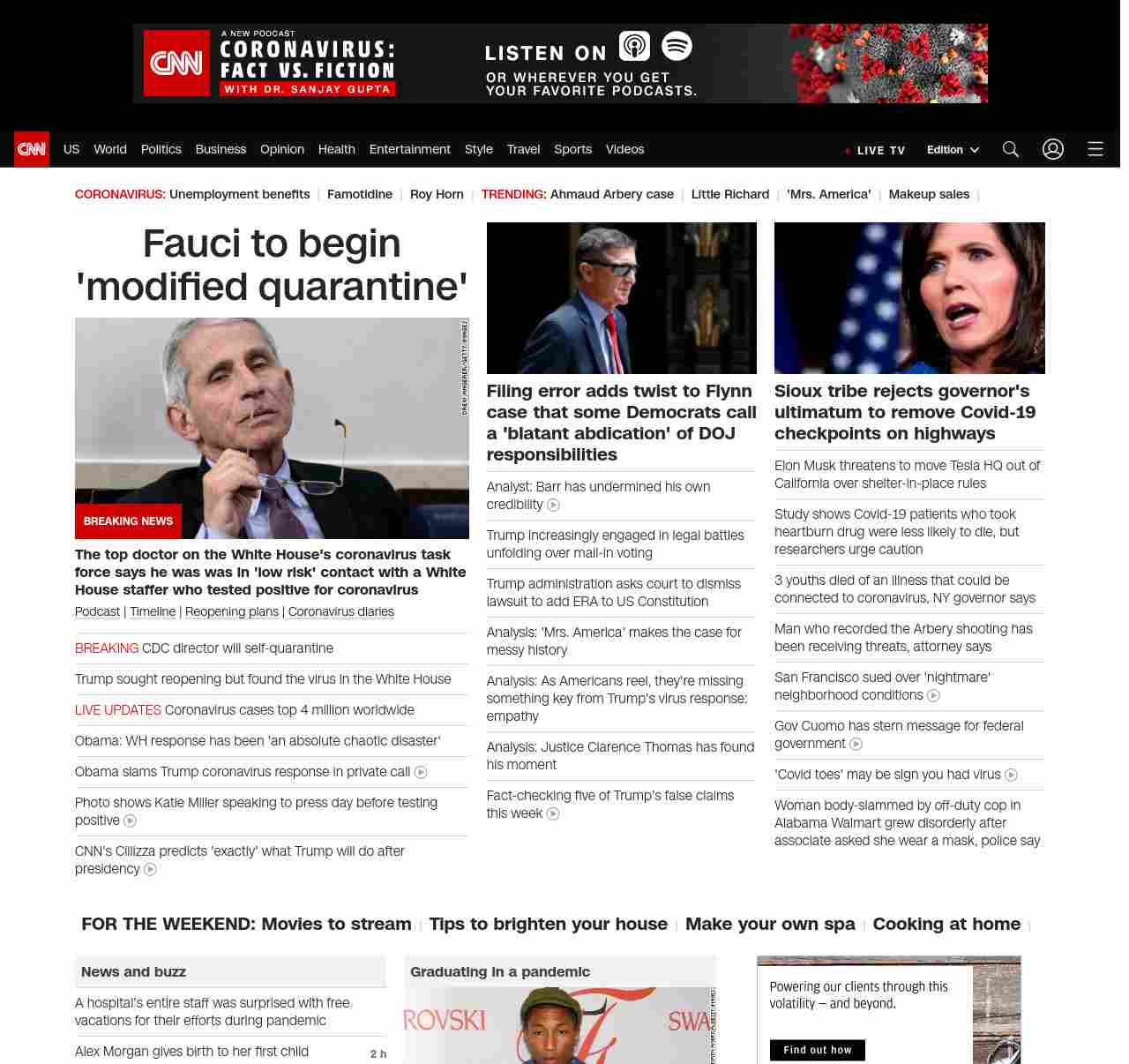 || screaming-banner-text banner-text-size–char-38″ data-analytics=”_list-hierarchical-xs_article_”> Fauci to begin ‘modified quarantine’ ||” , title: “CNN – Breaking News, Latest News and Videos” , siblings: {“articleList”:[{“uri”:”/2020/05/09/politics/fauci-modified-quarantine-coronavirus/index.html”,”headline”:”The top doctor on the White House’s coronavirus task force says he was was in ‘low risk’ contact with a White House staffer who tested positive for coronavirus”,”thumbnail”:”//cdn.cnn.com/cnnnext/dam/assets/200501192359-fauci-0422-small-11.jpg”,”duration”:””,”description”:”u003ca href=”https://www.cnn.com/audio/podcasts/corona-virus” target=”_blank”>Podcastu003c/a> | u003ca href=”https://www.cnn.com/interactive/2020/health/covid19-pandemic-video-timeline/index.html” target=”_blank”>Timelineu003c/a> | u003ca href=”https://www.cnn.com/interactive/2020/us/states-reopen-coronavirus-trnd/” target=”_blank”>Reopening plansu003c/a> | u003ca href=”https://www.cnn.com/specials/world/coronavirus-diaries” target=”_blank”>Coronavirus diariesu003c/a>”,”layout”:””
