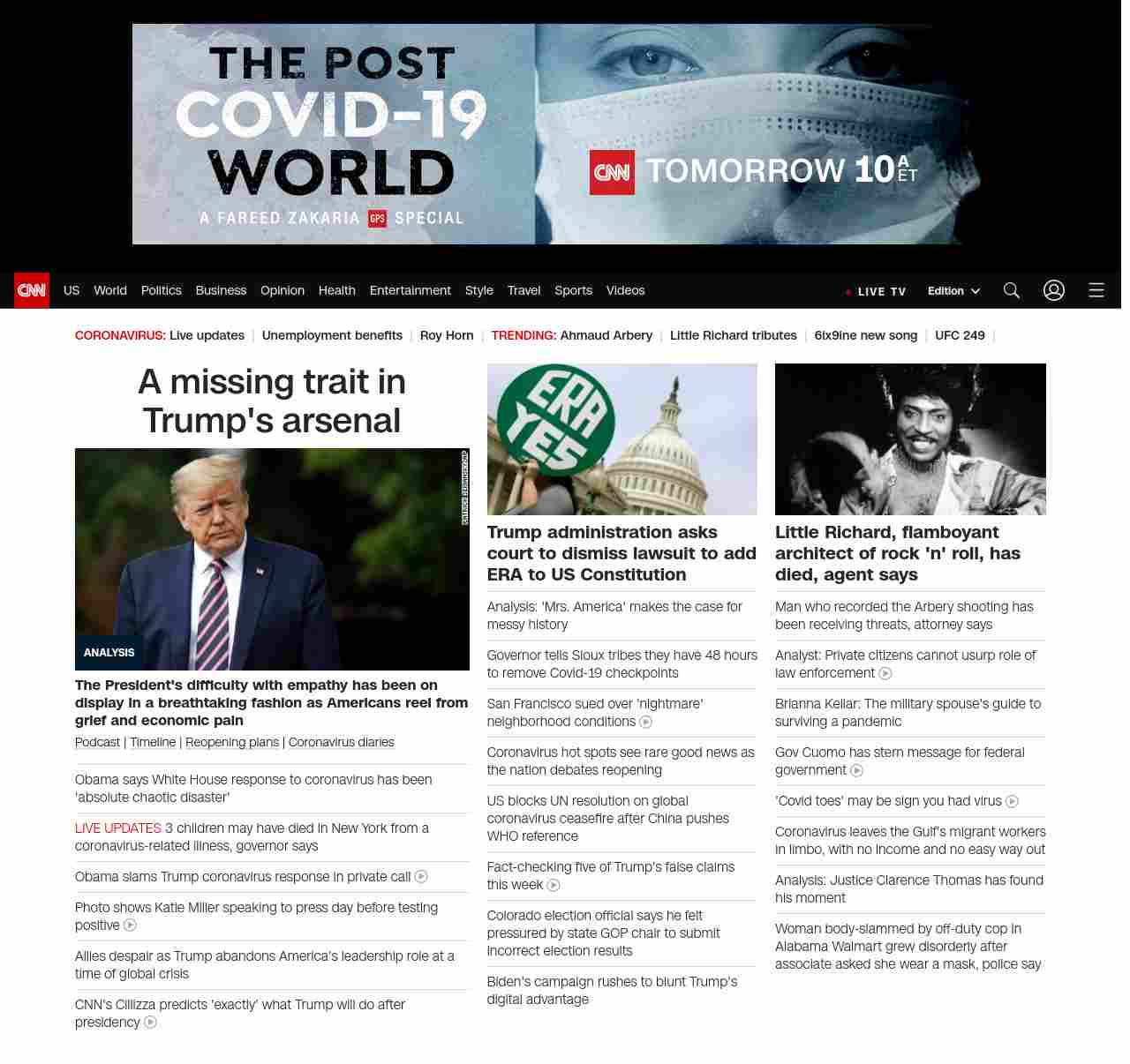 || screaming-banner-text banner-text-size–char-35″ data-analytics=”_list-hierarchical-xs_article_”> A missing trait in Trump’s arsenal ||” , title: “CNN – Breaking News, Latest News and Videos” , siblings: {“articleList”:[{“uri”:”/travel/article/spanish-beach-reservations/index.html”,”headline”:”u003cstrong>The pandemic has pushed this town to change the way its beaches will function. Here’s the plan.u003c/strong>”,”thumbnail”:”//cdn.cnn.com/cnnnext/dam/assets/200508161418-spanish-beach-grid-sanxenxo-small-11.jpg”,”duration”:””,”description”:”u003ca href=”https://www.cnn.com/audio/podcasts/corona-virus” target=”_blank”>Podcastu003c/a> | u003ca href=”https://www.cnn.com/interactive/2020/health/covid19-pandemic-video-timeline/index.html” target=”_blank”>Timelineu003c/a> | u003ca href=”https://www.cnn.com/interactive/2020/us/states-reopen-coronavirus-trnd/” target=”_blank”>Reopening plansu003c/a> | u003ca href=”https://www.cnn.com/specials/world/coronavirus-diaries” target=”_blank”>Coronavirus diariesu003c/a>”,”layout”:””