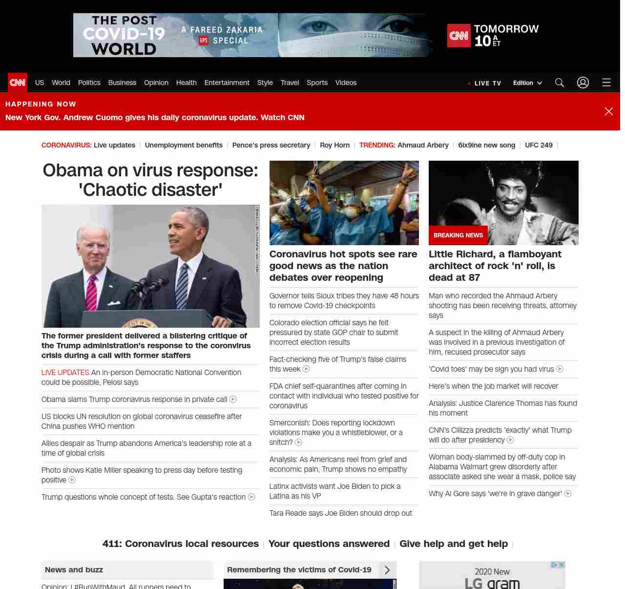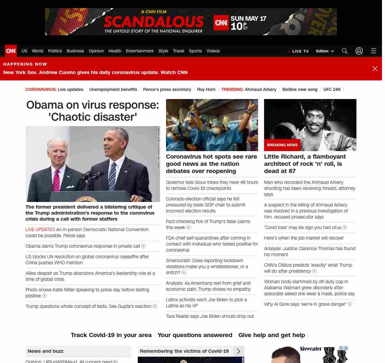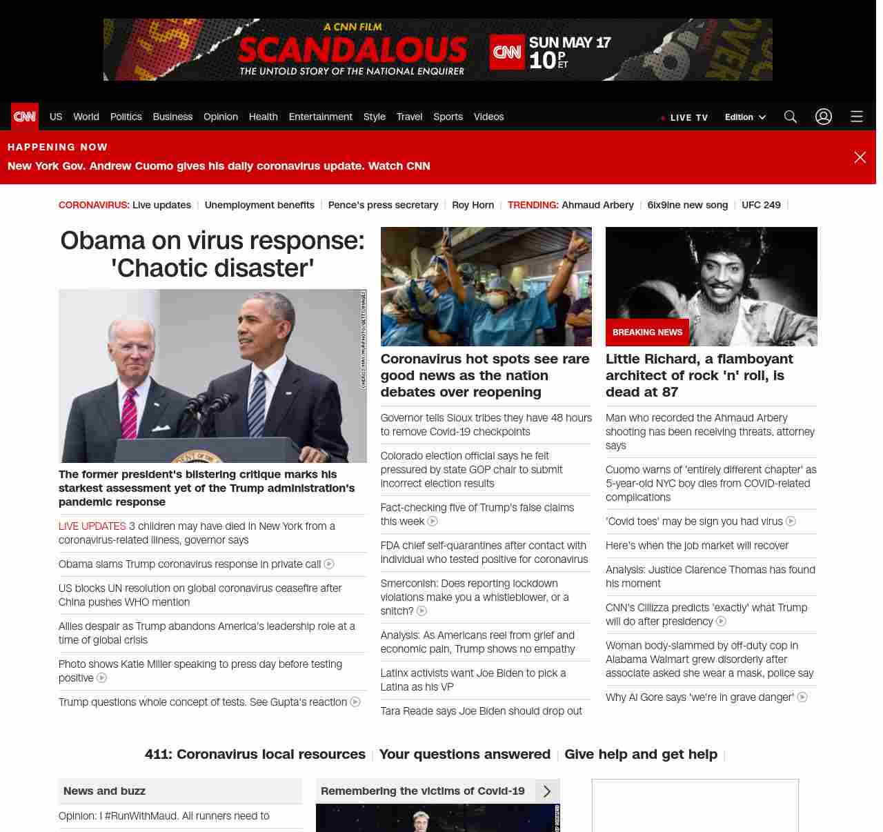 || screaming-banner-text banner-text-size–char-44″ data-analytics=”_list-hierarchical-xs_article_”> Obama on virus response: ‘Chaotic disaster’ ||” , title: “CNN – Breaking News, Latest News and Videos” , siblings: {“articleList”:[{“uri”:”/2020/05/09/politics/obama-trump-coronavirus-response-flynn-case/index.html”,”headline”:”u003cstrong>The former president’s blistering critique marks his starkest assessment yet of the Trump administration’s pandemic responseu003c/strong>”,”thumbnail”:”//cdn.cnn.com/cnnnext/dam/assets/200414101259-obama-biden-file-2016-small-11.jpg”,”duration”:””,”description”:”u003ca href=”https://www.cnn.com/audio/podcasts/corona-virus” target=”_blank”>Podcastu003c/a> | u003ca href=”https://www.cnn.com/interactive/2020/health/covid19-pandemic-video-timeline/index.html” target=”_blank”>Timelineu003c/a> | u003ca href=”https://www.cnn.com/interactive/2020/us/states-reopen-coronavirus-trnd/” target=”_blank”>Reopening plansu003c/a> | u003ca href=”https://www.cnn.com/specials/world/coronavirus-diaries” target=”_blank”>Coronavirus diariesu003c/a> | u003ca href=”https://www.cnn.com/2020/05/09/world/coronavirus-newsletter-05-09-20-intl/index.html” target=”_blank”>Catch upu003c/a>”,”layout”:””