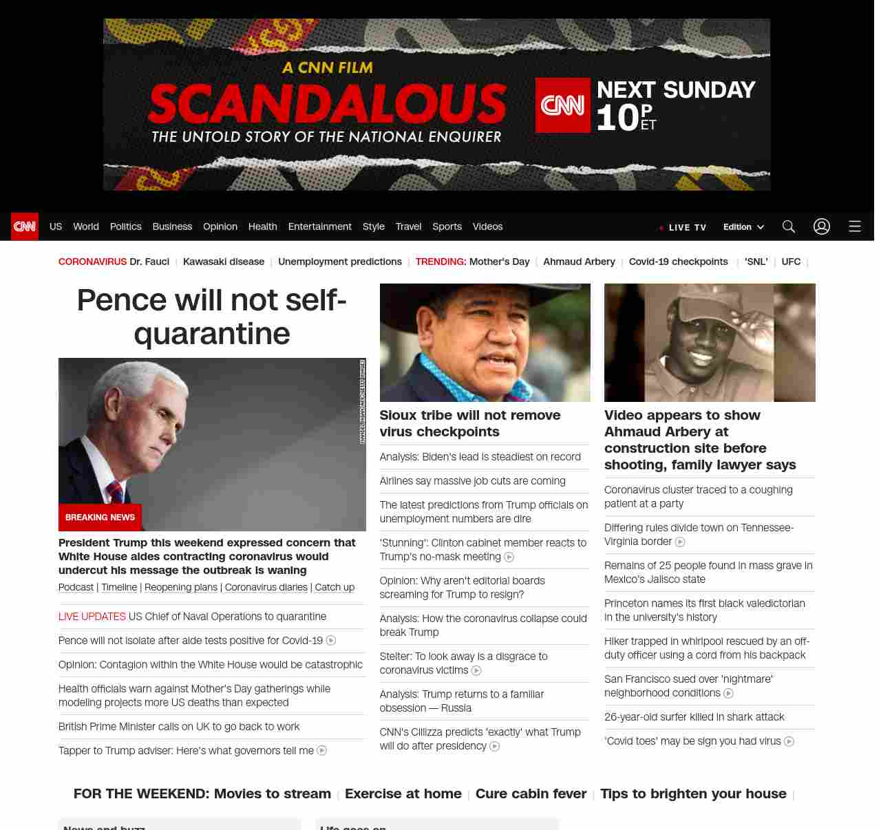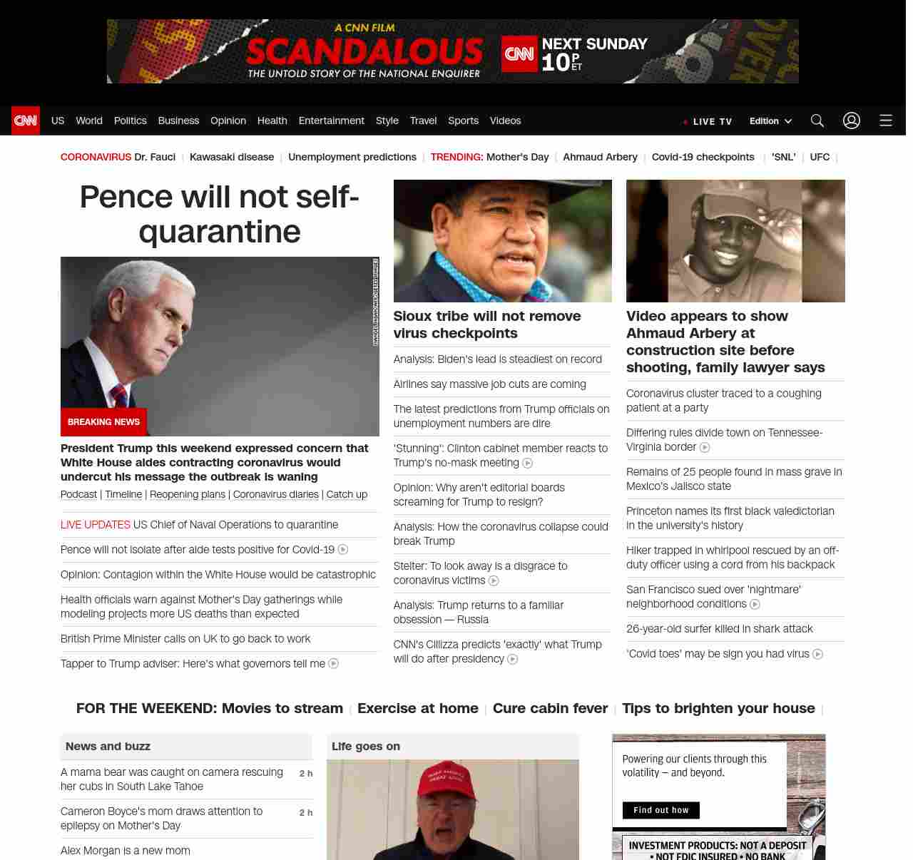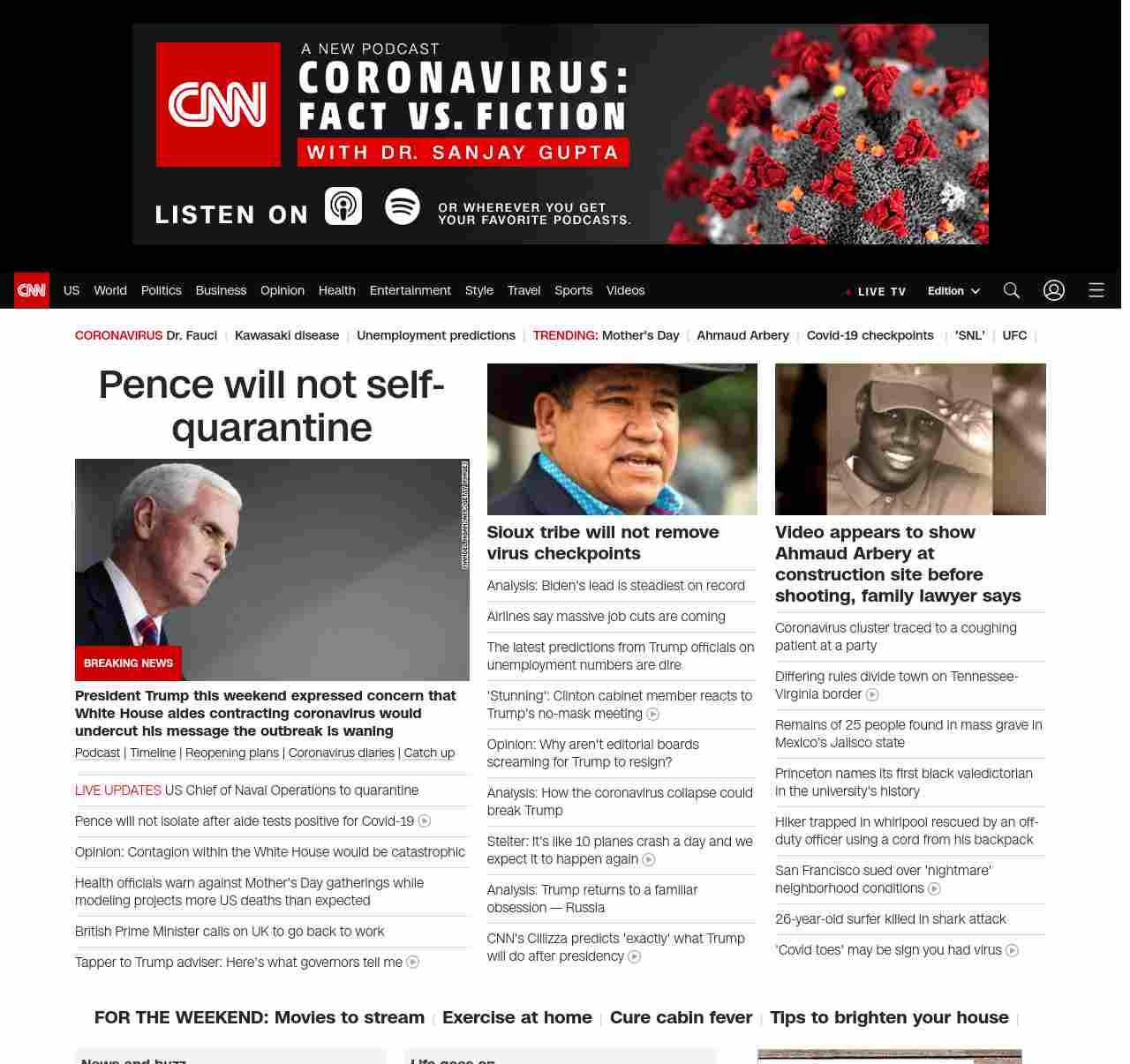 || screaming-banner-text banner-text-size–char-32″ data-analytics=”_list-hierarchical-xs_article_”> Pence will not self-quarantine ||” , title: “CNN – Breaking News, Latest News and Videos” , siblings: {“articleList”:[{“uri”:”/2020/05/10/politics/mike-pence-self-isolate-coronavirus/index.html”,”headline”:”u003cstrong>President Trump this weekend expressed concern that White House aides contracting coronavirus would undercut his message the outbreak is waningu003c/strong>”,”thumbnail”:”//cdn.cnn.com/cnnnext/dam/assets/200510202245-pence-trump-coronavirus-briefing-0423-small-11.jpg”,”duration”:””,”description”:”u003ca href=”https://www.cnn.com/audio/podcasts/corona-virus” target=”_blank”>Podcastu003c/a> | u003ca href=”https://www.cnn.com/interactive/2020/health/covid19-pandemic-video-timeline/index.html” target=”_blank”>Timelineu003c/a> | u003ca href=”https://www.cnn.com/interactive/2020/us/states-reopen-coronavirus-trnd/” target=”_blank”>Reopening plansu003c/a> | u003ca href=”https://www.cnn.com/specials/world/coronavirus-diaries” target=”_blank”>Coronavirus diariesu003c/a> | u003ca href=”https://www.cnn.com/2020/05/10/world/coronavirus-newsletter-05-10-20-intl/index.html” target=”_blank”>Catch upu003c/a> “,”layout”:””