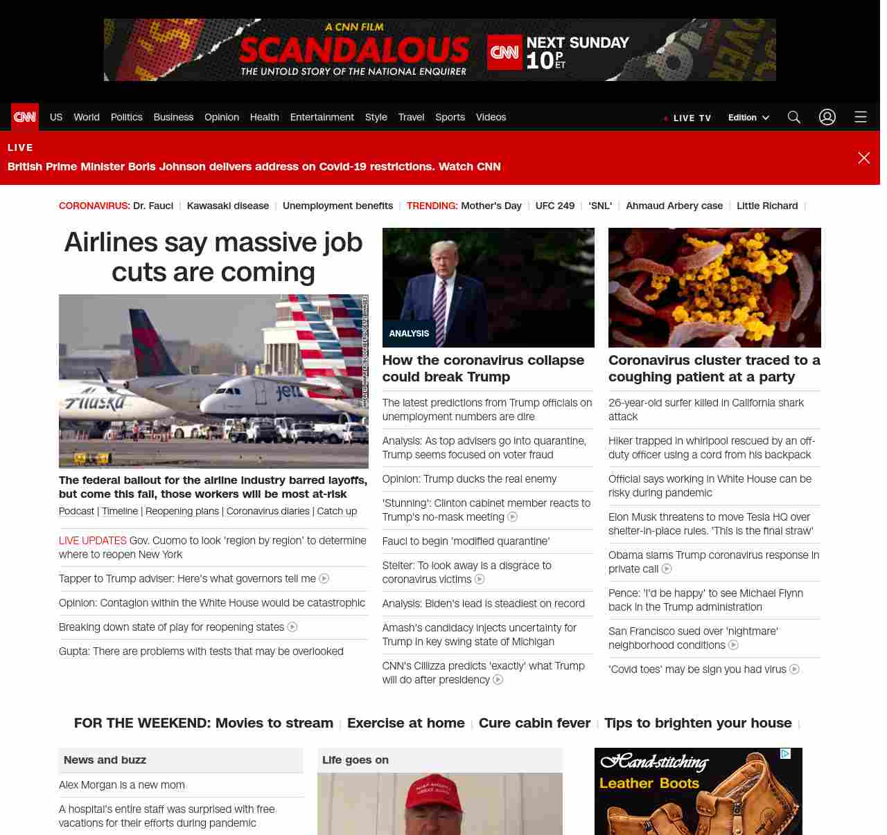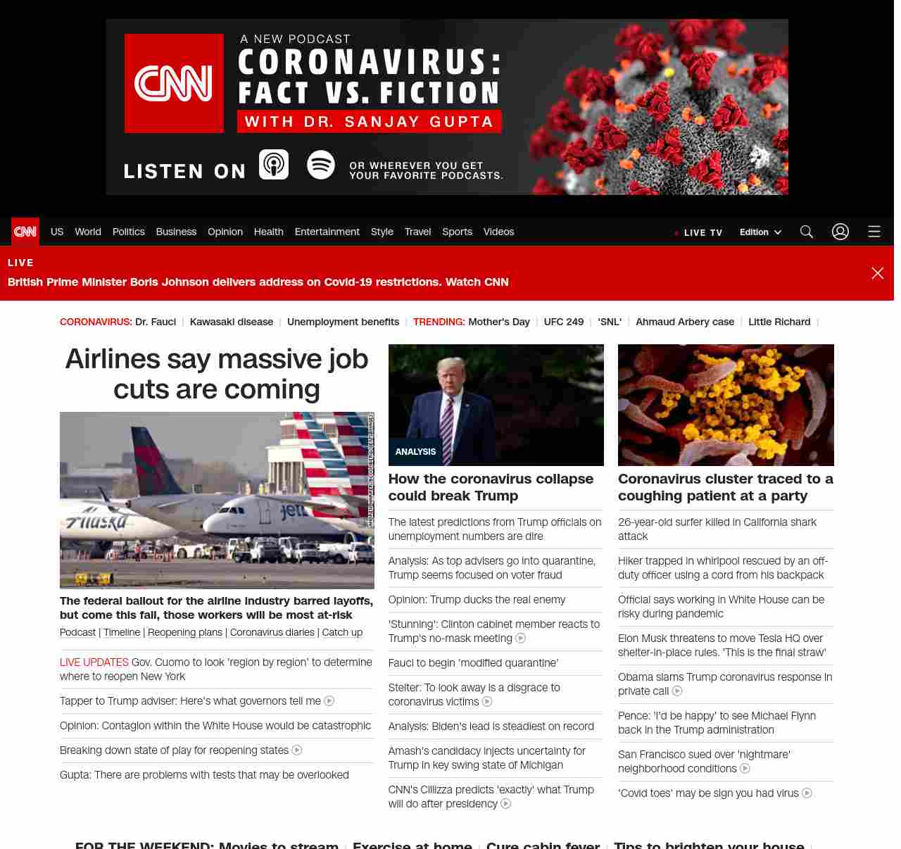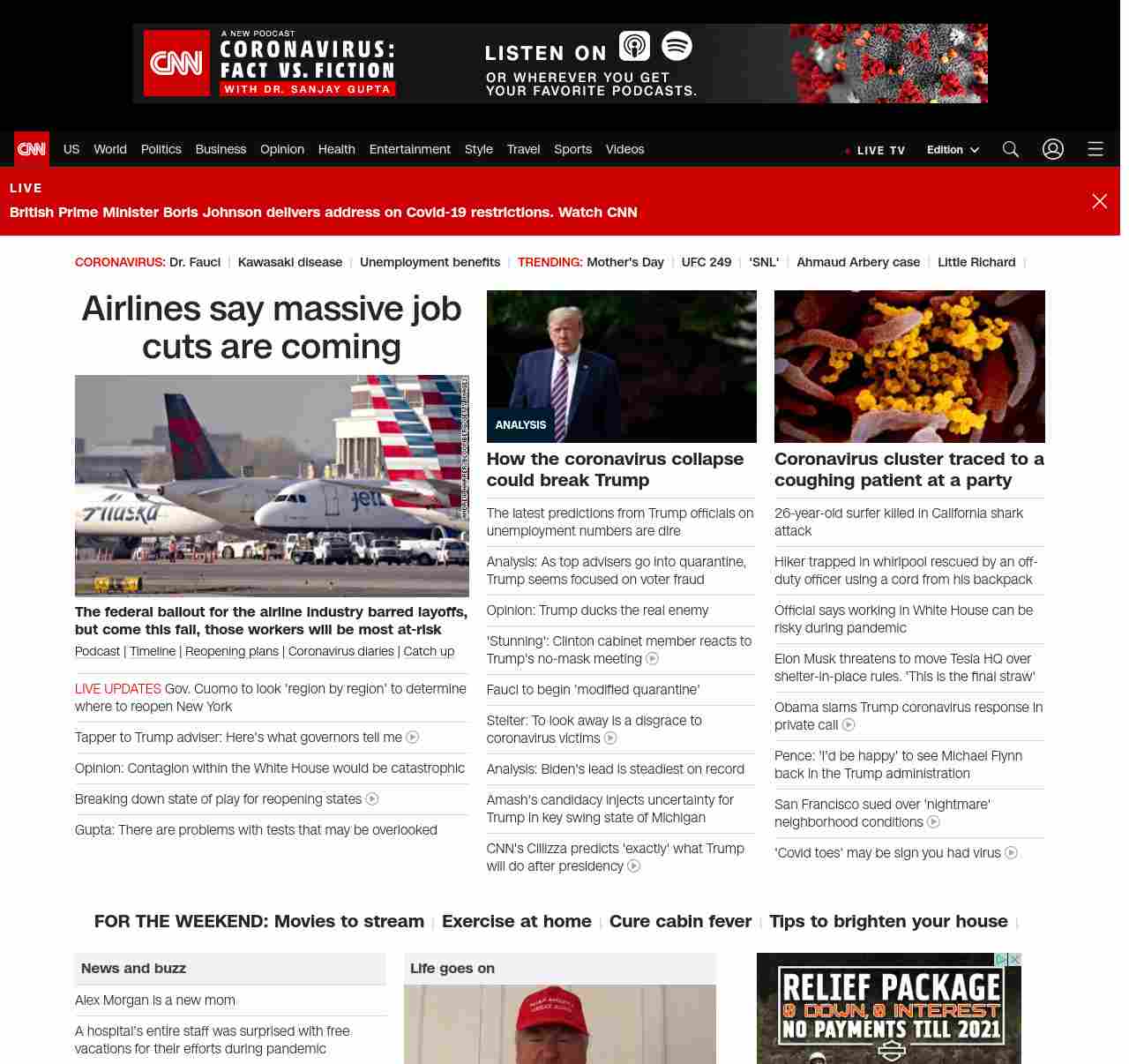 || screaming-banner-text banner-text-size–char-41″ data-analytics=”_list-hierarchical-xs_article_”> Airlines say massive job cuts are coming ||” , title: “CNN – Breaking News, Latest News and Videos” , siblings: {“articleList”:[{“uri”:”/2020/05/10/business/airline-job-cuts/index.html”,”headline”:”u003cstrong>The federal bailout for the airline industry barred layoffs, but come this fall, those workers will be most at-risku003c/strong>”,”thumbnail”:”//cdn.cnn.com/cnnnext/dam/assets/200508092320-airline-jobs-small-11.jpg”,”duration”:””,”description”:”u003ca href=”https://www.cnn.com/audio/podcasts/corona-virus” target=”_blank”>Podcastu003c/a> | u003ca href=”https://www.cnn.com/interactive/2020/health/covid19-pandemic-video-timeline/index.html” target=”_blank”>Timelineu003c/a> | u003ca href=”https://www.cnn.com/interactive/2020/us/states-reopen-coronavirus-trnd/” target=”_blank”>Reopening plansu003c/a> | u003ca href=”https://www.cnn.com/specials/world/coronavirus-diaries” target=”_blank”>Coronavirus diariesu003c/a> | u003ca href=”https://www.cnn.com/2020/05/10/world/coronavirus-newsletter-05-10-20-intl/index.html” target=”_blank”>Catch upu003c/a>”,”layout”:””
