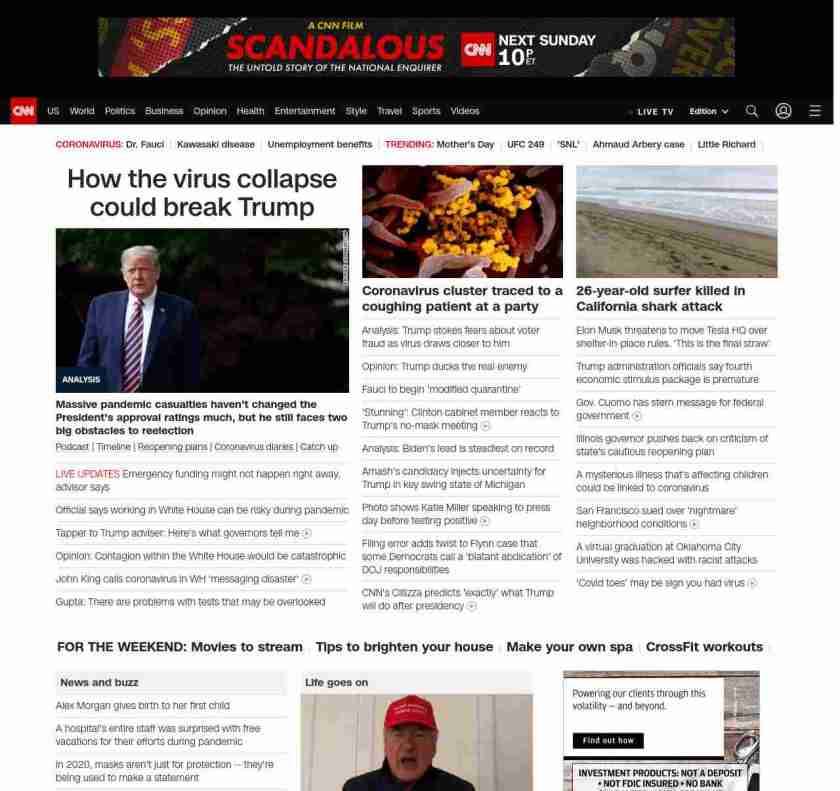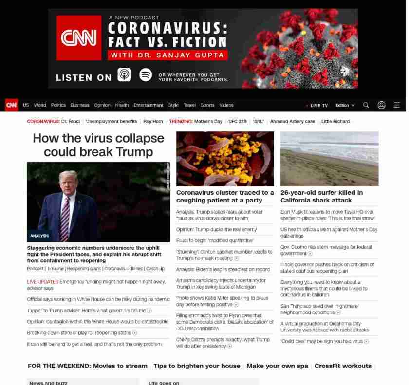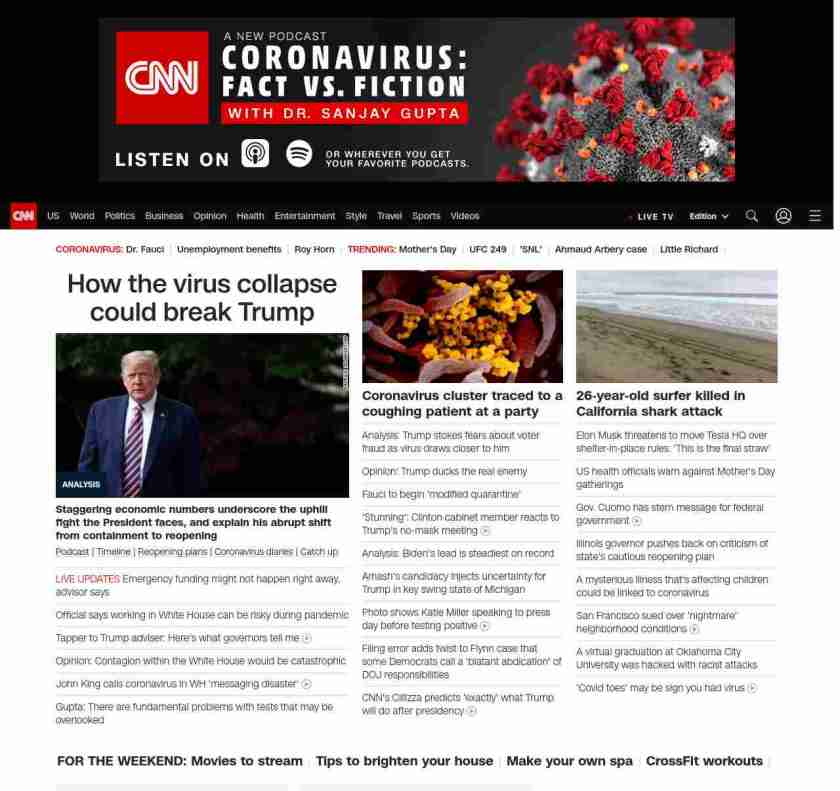 || screaming-banner-text banner-text-size–char-41″ data-analytics=”_list-hierarchical-xs_article_”> How the virus collapse could break Trump ||” , title: “CNN – Breaking News, Latest News and Videos” , siblings: {“articleList”:[{“uri”:”/2020/05/10/politics/trump-reelection-economy-unemployment/index.html”,”headline”:”u003cstrong>Massive pandemic casualties haven’t changed the President’s approval ratings much, but he still faces two big obstacles to reelectionu003c/strong>”,”thumbnail”:”//cdn.cnn.com/cnnnext/dam/assets/200508153102-04-trump-0505-lead-image-small-11.jpg”,”duration”:””,”description”:”u003ca href=”https://www.cnn.com/audio/podcasts/corona-virus” target=”_blank”>Podcastu003c/a> | u003ca href=”https://www.cnn.com/interactive/2020/health/covid19-pandemic-video-timeline/index.html” target=”_blank”>Timelineu003c/a> | u003ca href=”https://www.cnn.com/interactive/2020/us/states-reopen-coronavirus-trnd/” target=”_blank”>Reopening plansu003c/a> | u003ca href=”https://www.cnn.com/specials/world/coronavirus-diaries” target=”_blank”>Coronavirus diariesu003c/a> | u003ca href=”https://www.cnn.com/2020/05/10/world/coronavirus-newsletter-05-10-20-intl/index.html” target=”_blank”>Catch upu003c/a>”,”layout”:””