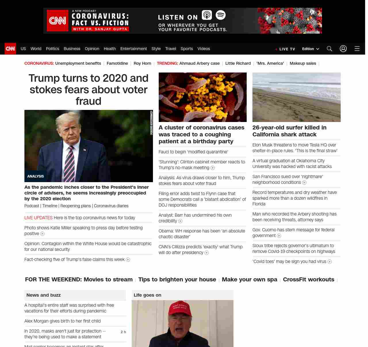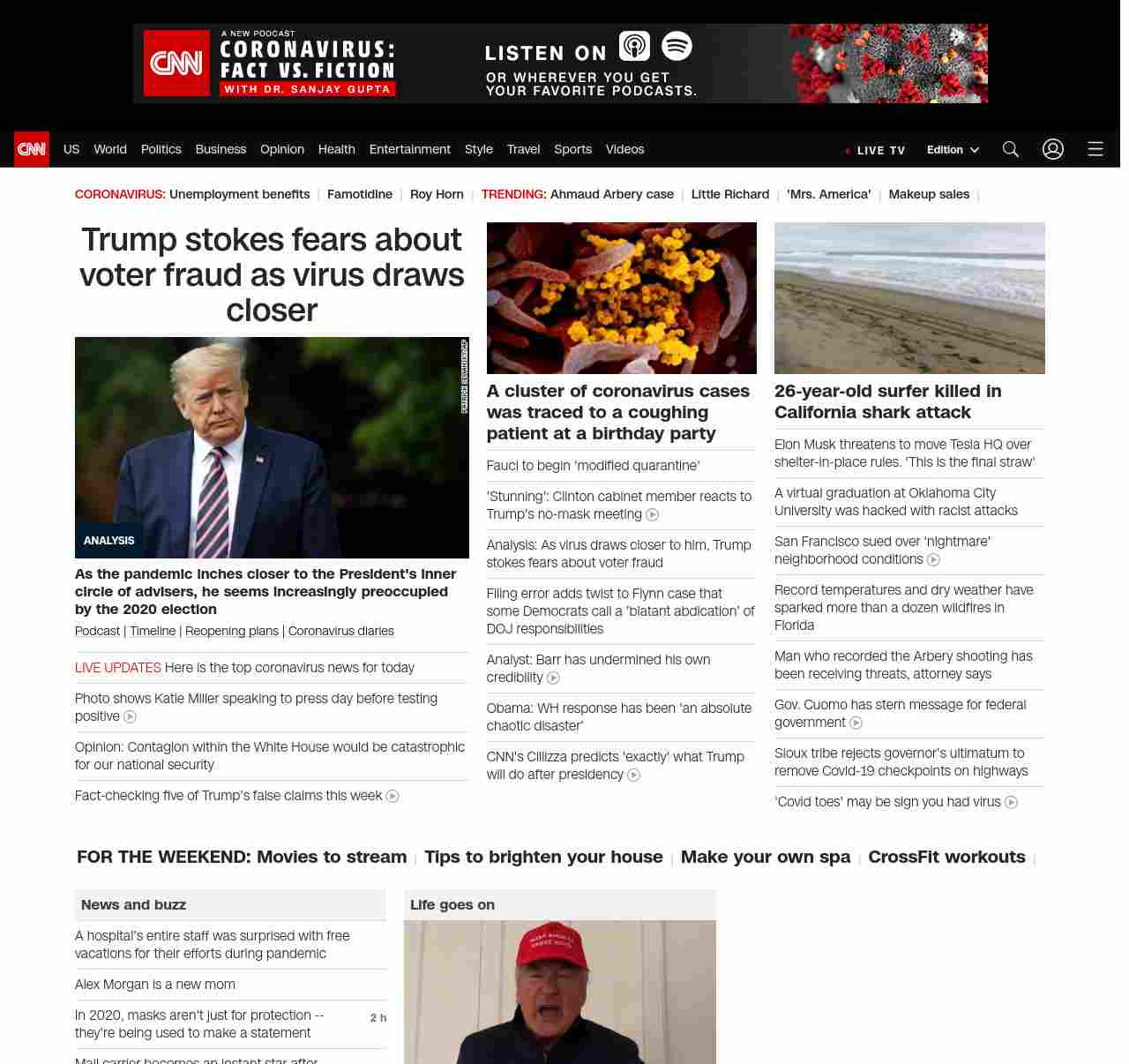 || screaming-banner-text banner-text-size–char-47″ data-analytics=”_list-hierarchical-xs_article_”> Trump stokes fears about voter fraud as virus draws closer ||” , title: “CNN – Breaking News, Latest News and Videos” , siblings: {“articleList”:[{“uri”:”/2020/05/10/politics/coronavirus-white-house-trump-2020-voter-fraud/index.html”,”headline”:”u003cstrong>As the pandemic inches closer to the President’s inner circle of advisers, he seems increasingly preoccupied by the 2020 electionu003c/strong>”,”thumbnail”:”//cdn.cnn.com/cnnnext/dam/assets/200508153002-02-trump-0505-lead-image-small-11.jpg”,”duration”:””,”description”:”u003ca href=”https://www.cnn.com/audio/podcasts/corona-virus” target=”_blank”>Podcastu003c/a> | u003ca href=”https://www.cnn.com/interactive/2020/health/covid19-pandemic-video-timeline/index.html” target=”_blank”>Timelineu003c/a> | u003ca href=”https://www.cnn.com/interactive/2020/us/states-reopen-coronavirus-trnd/” target=”_blank”>Reopening plansu003c/a> | u003ca href=”https://www.cnn.com/specials/world/coronavirus-diaries” target=”_blank”>Coronavirus diariesu003c/a>”,”layout”:””