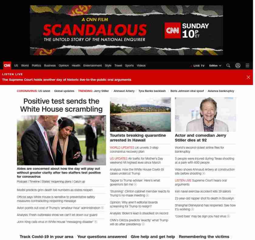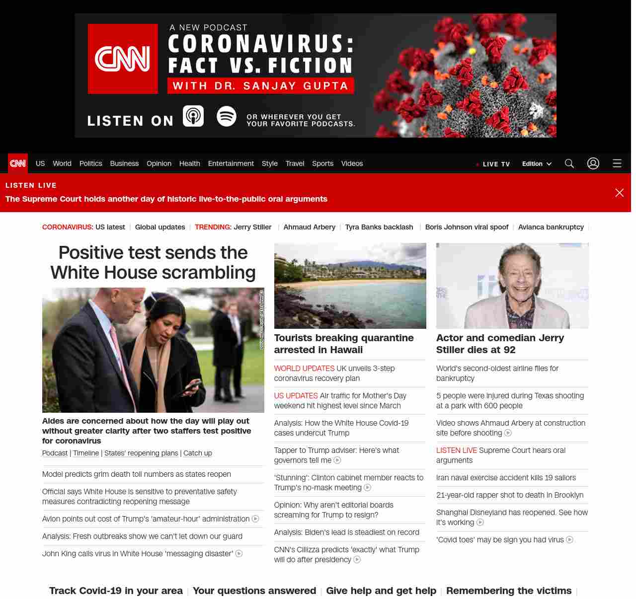 || screaming-banner-text banner-text-size–char-47″ data-analytics=”_list-hierarchical-xs_article_”> Positive test sends the White House scrambling ||” , title: “CNN – Breaking News, Latest News and Videos” , siblings: {“articleList”:[{“uri”:”/2020/05/11/politics/katie-miller-contract-tracing-coronavirus/index.html”,”headline”:”u003cstrong>Aides are concerned about how the day will play out without greater clarity after two staffers test positive for coronavirusu003c/strong>”,”thumbnail”:”//cdn.cnn.com/cnnnext/dam/assets/200508150921-katie-miller-0324-small-11.jpg”,”duration”:””,”description”:”u003ca href=”https://www.cnn.com/audio/podcasts/corona-virus” target=”_blank”>Podcastu003c/a> | u003ca href=”https://www.cnn.com/interactive/2020/health/covid19-pandemic-video-timeline/index.html” target=”_blank”>Timelineu003c/a> | u003ca href=”https://www.cnn.com/interactive/2020/us/states-reopen-coronavirus-trnd/” target=”_blank”>States’ reopening plansu003c/a> | u003ca href=”https://www.cnn.com/2020/05/11/world/coronavirus-newsletter-05-11-20-intl/index.html” target=”_blank”>Catch upu003c/a>”,”layout”:””