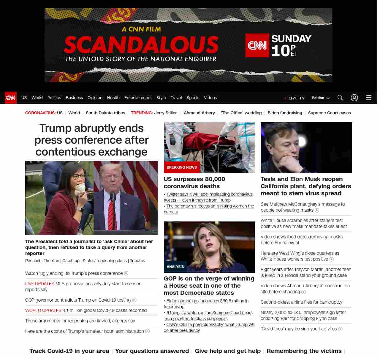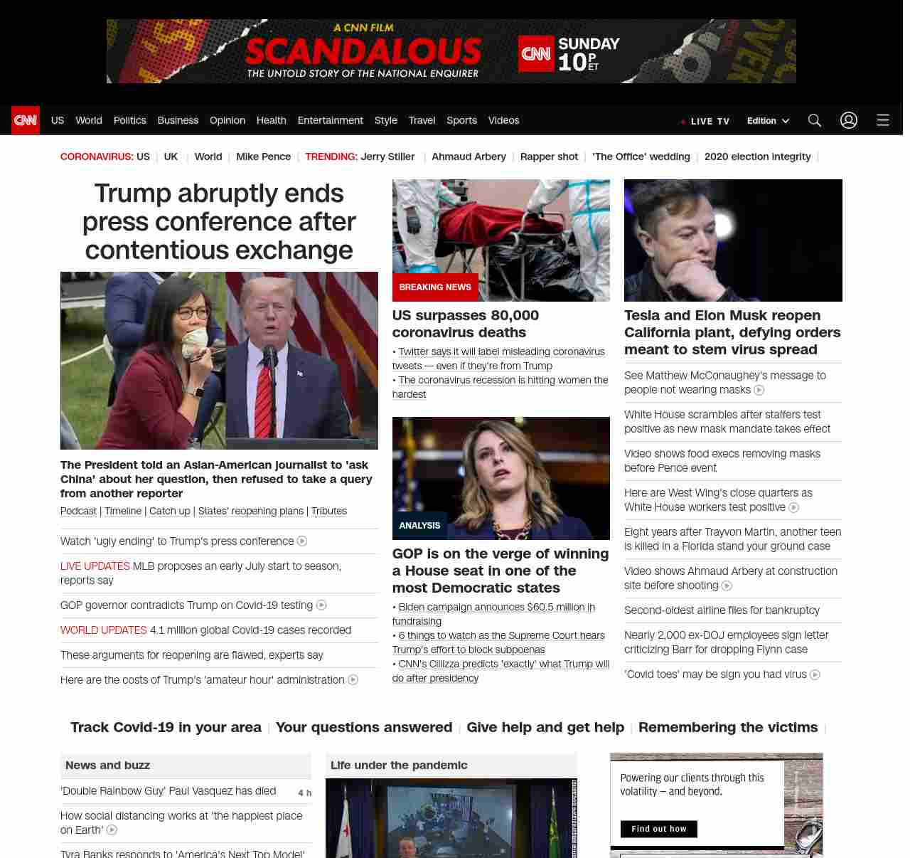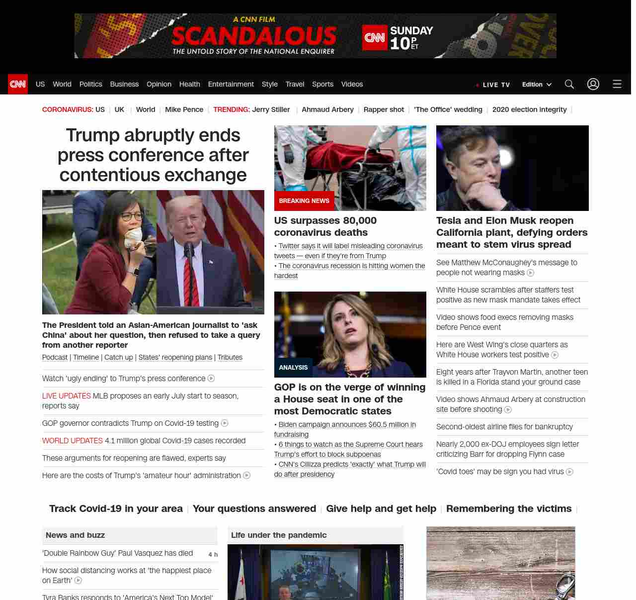 || screaming-banner-text banner-text-size–char-47″ data-analytics=”_list-hierarchical-xs_article_”> Trump abruptly ends press conference after contentious exchange ||” , title: “CNN – Breaking News, Latest News and Videos” , siblings: {“articleList”:[{“uri”:”/2020/05/11/media/trump-press-briefing-weijia-jian-kaitlan-collins/index.html”,”headline”:”u003cstrong>The President told an Asian-American journalist to ‘ask China’ about her question, then refused to take a query from another reporteru003c/strong>”,”thumbnail”:””,”duration”:””,”description”:”u003ca href=”https://www.cnn.com/audio/podcasts/corona-virus” target=”_blank”>Podcastu003c/a> | u003ca href=”https://www.cnn.com/interactive/2020/health/covid19-pandemic-video-timeline/index.html” target=”_blank”>Timelineu003c/a> | u003ca href=”https://www.cnn.com/2020/05/11/world/coronavirus-newsletter-05-11-20-intl/index.html” target=”_blank”>Catch upu003c/a> | u003ca href=”https://www.cnn.com/interactive/2020/us/states-reopen-coronavirus-trnd/” target=”_blank”>States’ reopening plansu003c/a> | u003ca href=”https://www.cnn.com/interactive/2020/health/coronavirus-victims-memories/” target=”_blank”>Tributesu003c/a>”,”layout”:””