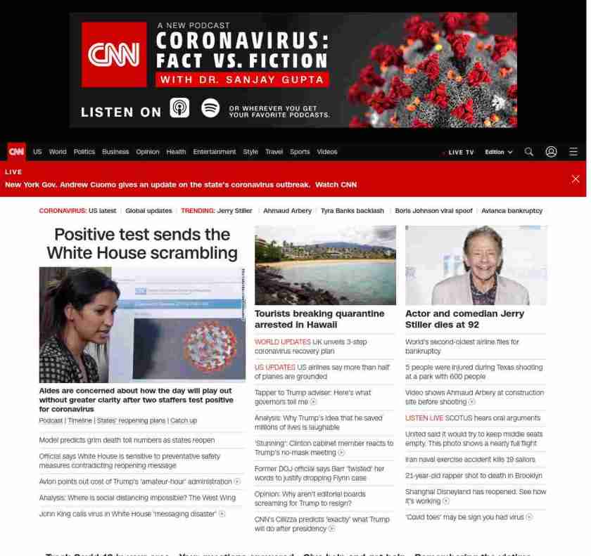 || screaming-banner-text banner-text-size–char-47″ data-analytics=”_list-hierarchical-xs_article_”> Positive test sends the White House scrambling ||” , title: “CNN – Breaking News, Latest News and Videos” , siblings: {“articleList”:[{“uri”:”/2020/05/11/politics/katie-miller-contract-tracing-coronavirus/index.html”,”headline”:”u003cstrong>Aides are concerned about how the day will play out without greater clarity after two staffers test positive for coronavirusu003c/strong>”,”thumbnail”:”//cdn.cnn.com/cnnnext/dam/assets/200511085306-02-katie-miller-file-small-11.jpg”,”duration”:””,”description”:”u003ca href=”https://www.cnn.com/audio/podcasts/corona-virus” target=”_blank”>Podcastu003c/a> | u003ca href=”https://www.cnn.com/interactive/2020/health/covid19-pandemic-video-timeline/index.html” target=”_blank”>Timelineu003c/a> | u003ca href=”https://www.cnn.com/interactive/2020/us/states-reopen-coronavirus-trnd/” target=”_blank”>States’ reopening plansu003c/a> | u003ca href=”https://www.cnn.com/2020/05/11/world/coronavirus-newsletter-05-11-20-intl/index.html” target=”_blank”>Catch upu003c/a>”,”layout”:””