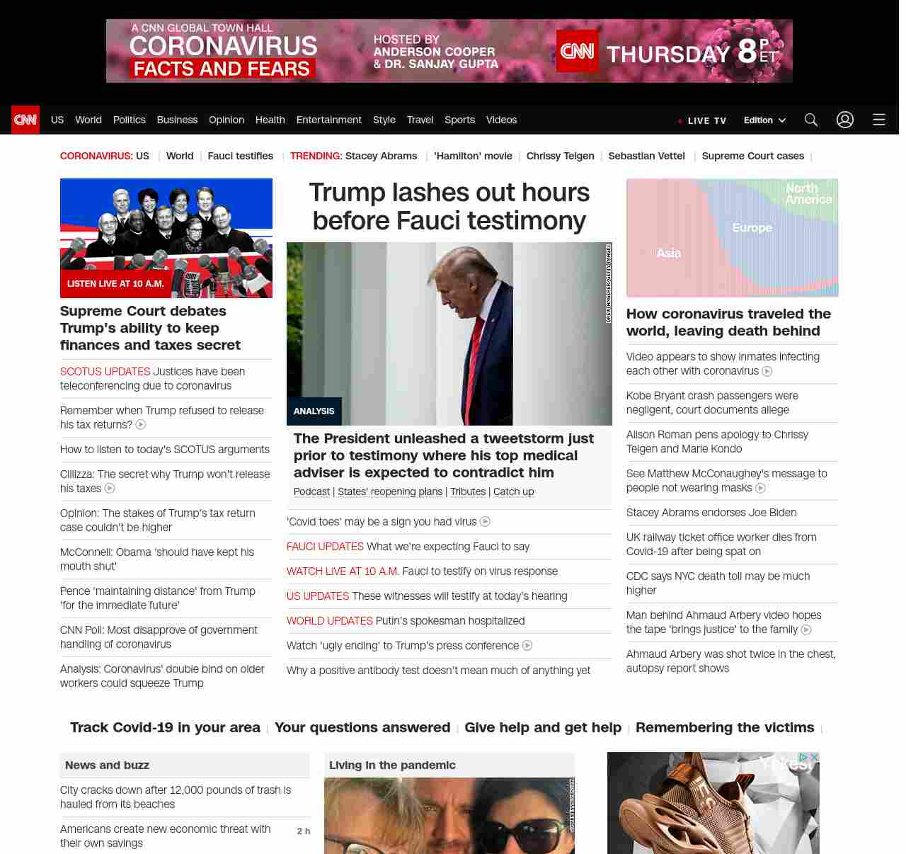 || screaming-banner-text banner-text-size–char-47″ data-analytics=”_list-hierarchical-xs_article_”> Trump lashes out hours before Fauci testimony ||” , title: “CNN – Breaking News, Latest News and Videos” , siblings: {“articleList”:[{“uri”:”/2020/05/12/politics/trump-taxes-financial-records-supreme-court/index.html”,”headline”:”Supreme Court debates Trump’s ability to keep finances and taxes secret”,”thumbnail”:”//cdn.cnn.com/cnnnext/dam/assets/200502084802-20200502-supreme-court-live-audio-gfx-small-11.jpg”,”duration”:””,”description”:”The u003ca href=”http://www.cnn.com/2013/06/10/us/u-s-supreme-court-fast-facts/index.html” target=”_blank”>Supreme Court u003c/a>will consider Tuesday whether the House of Representatives and a New York prosecutor can subpoena President Donald Trump’s accounting firm and banks for his financial documents, two momentous disputes concerning separation of powers and Trump’s broad claims of immunity. “,”layout”:””