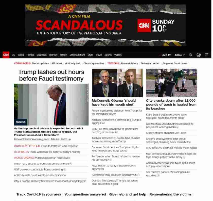 || screaming-banner-text banner-text-size–char-47″ data-analytics=”_list-hierarchical-xs_article_”> Trump lashes out hours before Fauci testimony ||” , title: “CNN – Breaking News, Latest News and Videos” , siblings: {“articleList”:[{“uri”:”/2020/05/12/politics/donald-trump-coronavirus-reelection/index.html”,”headline”:”u003cstrong>As the top medical adviser is expected to contradict Trump’s assurances that it’s safe to reopen, the President unleashed a tweetstormu003c/strong>”,”thumbnail”:”//cdn.cnn.com/cnnnext/dam/assets/200511170806-01-trump-testing-briefing-0511-small-11.jpg”,”duration”:””,”description”:”u003ca href=”https://www.cnn.com/audio/podcasts/corona-virus” target=”_blank”>Podcastu003c/a> | u003ca href=”https://www.cnn.com/interactive/2020/us/states-reopen-coronavirus-trnd/” target=”_blank”>States’ reopening plansu003c/a> | u003ca href=”https://www.cnn.com/interactive/2020/health/coronavirus-victims-memories/” target=”_blank”>Tributesu003c/a> | u003ca href=”https://www.cnn.com/2020/05/12/world/coronavirus-newsletter-05-12-20-intl/index.html” target=”_blank”>Catch upu003c/a>”,”layout”:””