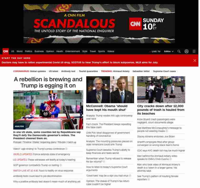 || screaming-banner-text banner-text-size–char-47″ data-analytics=”_list-hierarchical-xs_article_”> A rebellion is brewing and Trump is egging it on ||” , title: “CNN – Breaking News, Latest News and Videos” , siblings: {“articleList”:[{“uri”:”/2020/05/11/politics/what-matters-may-11/index.html”,”headline”:”u003cstrong>In one US state, some counties led by Republicans say they’ll defy the Democratic governor’s orders. The President cheered them on.u003c/strong>”,”thumbnail”:”//cdn.cnn.com/cnnnext/dam/assets/200512081727-01-reopen-protest-philadelphia-pennsylvania-0508-restricted-small-11.jpg”,”duration”:””,”description”:”u003ca href=”https://www.cnn.com/audio/podcasts/corona-virus” target=”_blank”>Podcastu003c/a> | u003ca href=”https://www.cnn.com/interactive/2020/health/covid19-pandemic-video-timeline/index.html” target=”_blank”>Timelineu003c/a> | u003ca href=”https://www.cnn.com/interactive/2020/us/states-reopen-coronavirus-trnd/” target=”_blank”>States’ reopening plansu003c/a> | u003ca href=”https://www.cnn.com/interactive/2020/health/coronavirus-victims-memories/” target=”_blank”>Tributesu003c/a> | u003ca href=”https://www.cnn.com/2020/05/12/world/coronavirus-newsletter-05-12-20-intl/index.html” target=”_blank”>Catch upu003c/a>”,”layout”:””