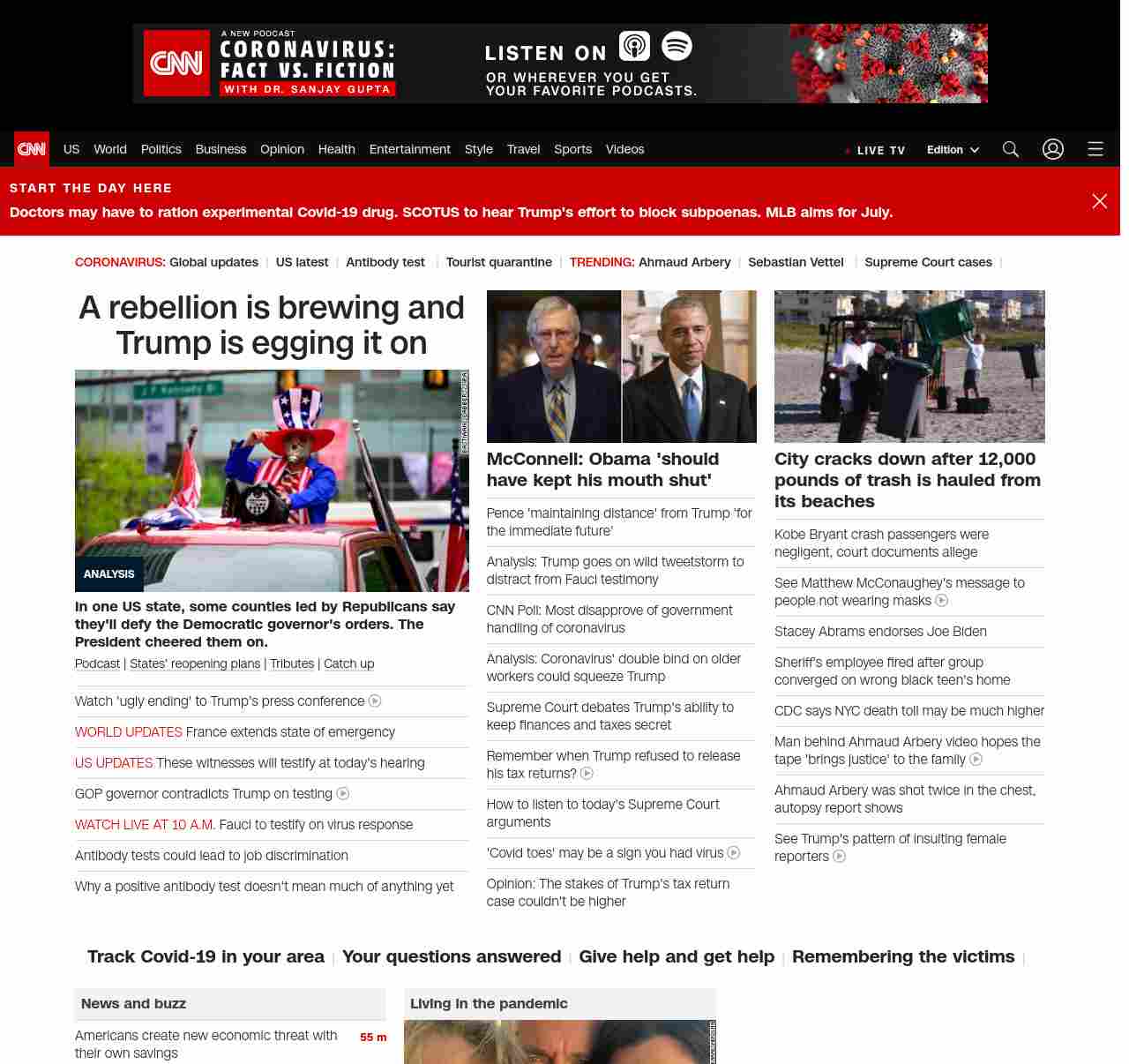 || screaming-banner-text banner-text-size–char-47″ data-analytics=”_list-hierarchical-xs_article_”> A rebellion is brewing and Trump is egging it on ||” , title: “CNN – Breaking News, Latest News and Videos” , siblings: {“articleList”:[{“uri”:”/2020/05/11/politics/what-matters-may-11/index.html”,”headline”:”u003cstrong>In one US state, some counties led by Republicans say they’ll defy the Democratic governor’s orders. The President cheered them on.u003c/strong>”,”thumbnail”:”//cdn.cnn.com/cnnnext/dam/assets/200512081727-01-reopen-protest-philadelphia-pennsylvania-0508-restricted-small-11.jpg”,”duration”:””,”description”:”u003ca href=”https://www.cnn.com/audio/podcasts/corona-virus” target=”_blank”>Podcastu003c/a> | u003ca href=”https://www.cnn.com/interactive/2020/us/states-reopen-coronavirus-trnd/” target=”_blank”>States’ reopening plansu003c/a> | u003ca href=”https://www.cnn.com/interactive/2020/health/coronavirus-victims-memories/” target=”_blank”>Tributesu003c/a> | u003ca href=”https://www.cnn.com/2020/05/12/world/coronavirus-newsletter-05-12-20-intl/index.html” target=”_blank”>Catch upu003c/a>”,”layout”:””
