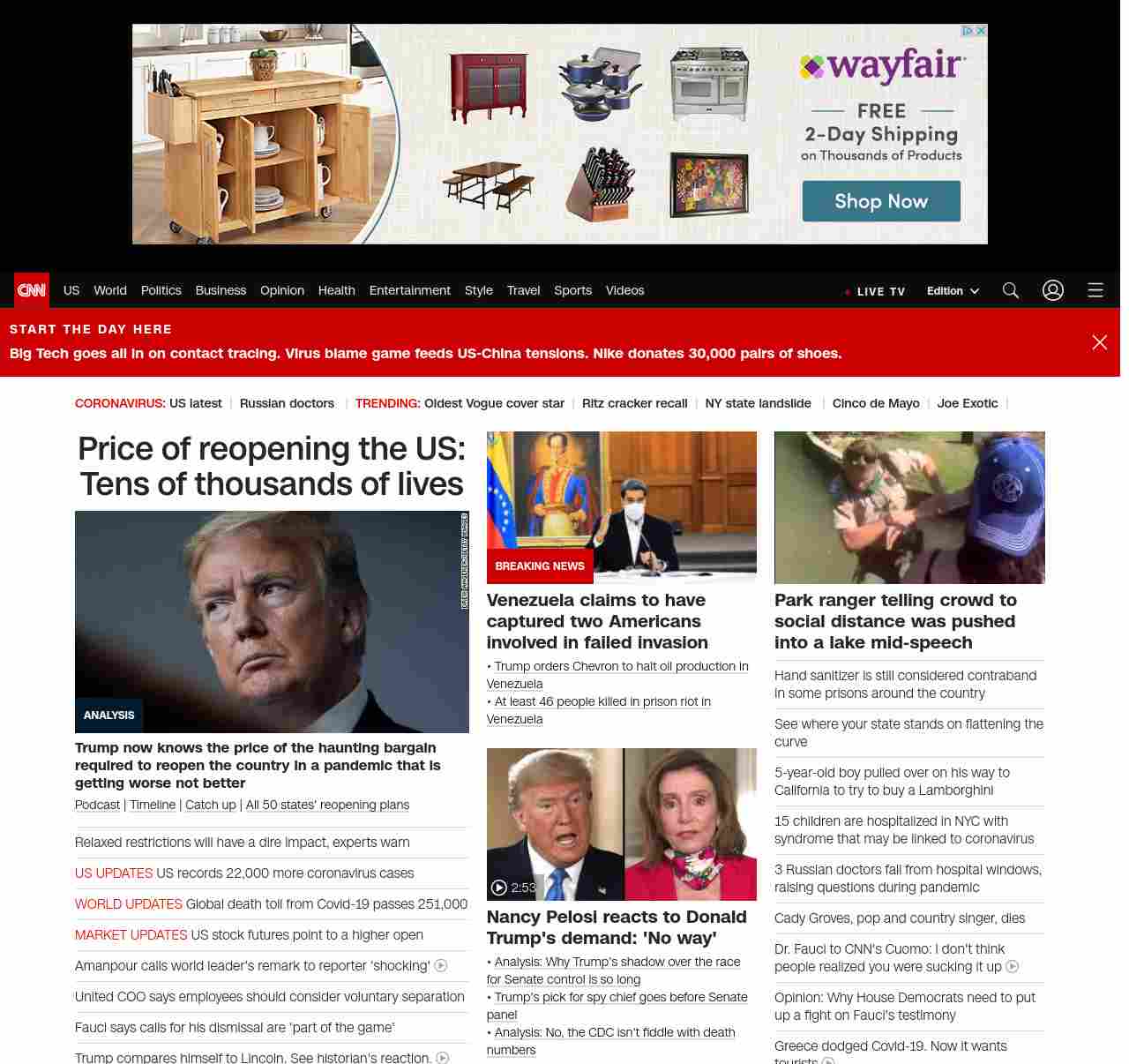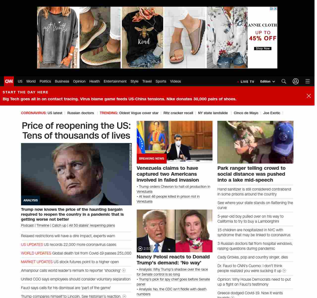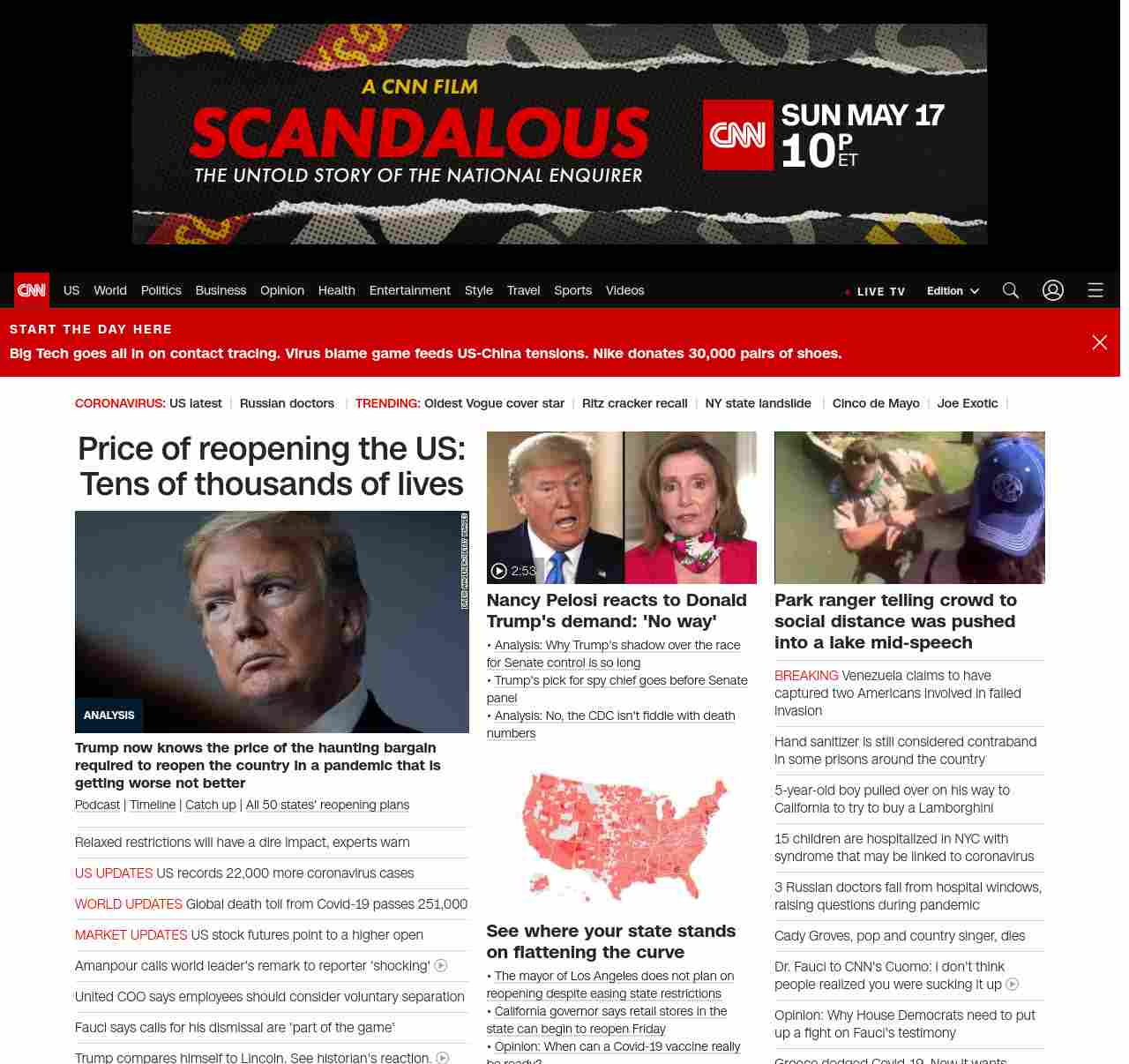 || screaming-banner-text banner-text-size–char-47″ data-analytics=”_list-hierarchical-xs_article_”> Price of reopening the US: Tens of thousands of lives ||” , title: “CNN – Breaking News, Latest News and Videos” , siblings: {“articleList”:[{“uri”:”/2020/05/05/politics/donald-trump-coronavirus-economy-models/index.html”,”headline”:”u003cstrong>Trump now knows the price of the haunting bargain required to reopen the country in a pandemic that is getting worse not betteru003c/strong>”,”thumbnail”:”//cdn.cnn.com/cnnnext/dam/assets/200430134358-01-trump-0421-small-11.jpg”,”duration”:””,”description”:”u003ca href=”https://www.cnn.com/audio/podcasts/corona-virus” target=”_blank”>Podcastu003c/a> | u003ca href=”https://www.cnn.com/interactive/2020/health/covid19-pandemic-video-timeline/index.html” target=”_blank”>Timelineu003c/a> | u003ca href=”https://www.cnn.com/2020/05/05/world/coronavirus-newsletter-05-05-20-intl/index.html” target=”_blank”>Catch upu003c/a> | u003ca href=”https://www.cnn.com/interactive/2020/us/states-reopen-coronavirus-trnd/” target=”_blank”>All 50 states’ reopening plansu003c/a>”,”layout”:””