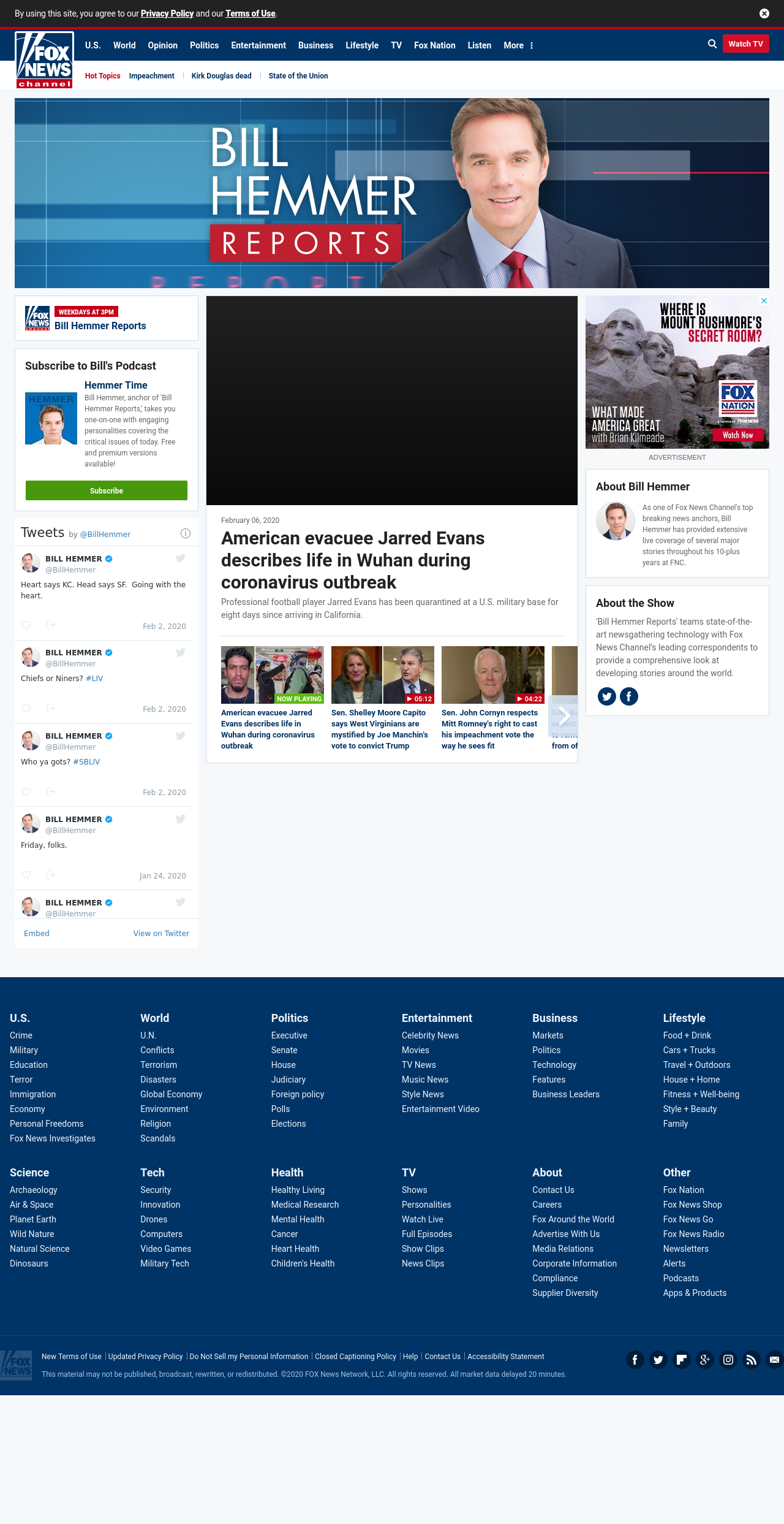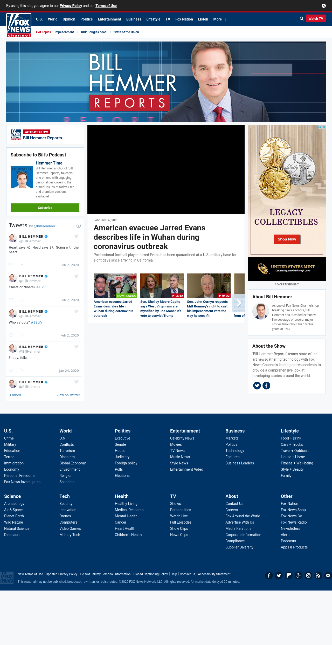 BH: American evacuee Jarred Evans describes life in Wuhan during coronavirus outbreak ((billhemmer________)) ((lubuntu at wor2)) Professional football player Jarred Evans has been quarantined at a U.S. military base for eight days since arriving in California