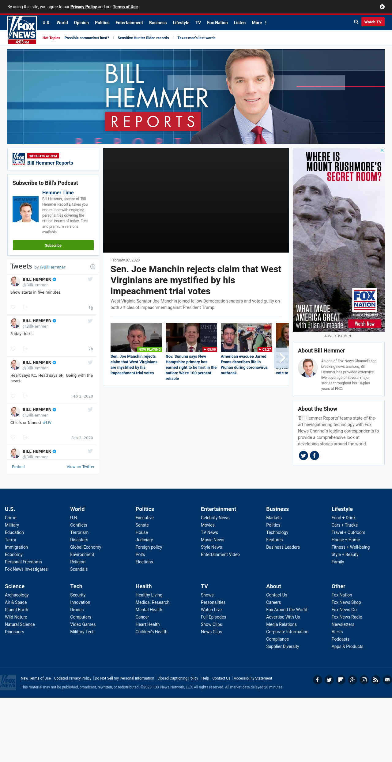 BH: Sen. Joe Manchin rejects claim that West Virginians are mystified by his impeachment trial votes ((billhemmer________)) ((lubuntu at wor2)) West Virginia Senator Joe Manchin joined fellow Democratic senators and voted guilty on both articles of impeachment against President Trump