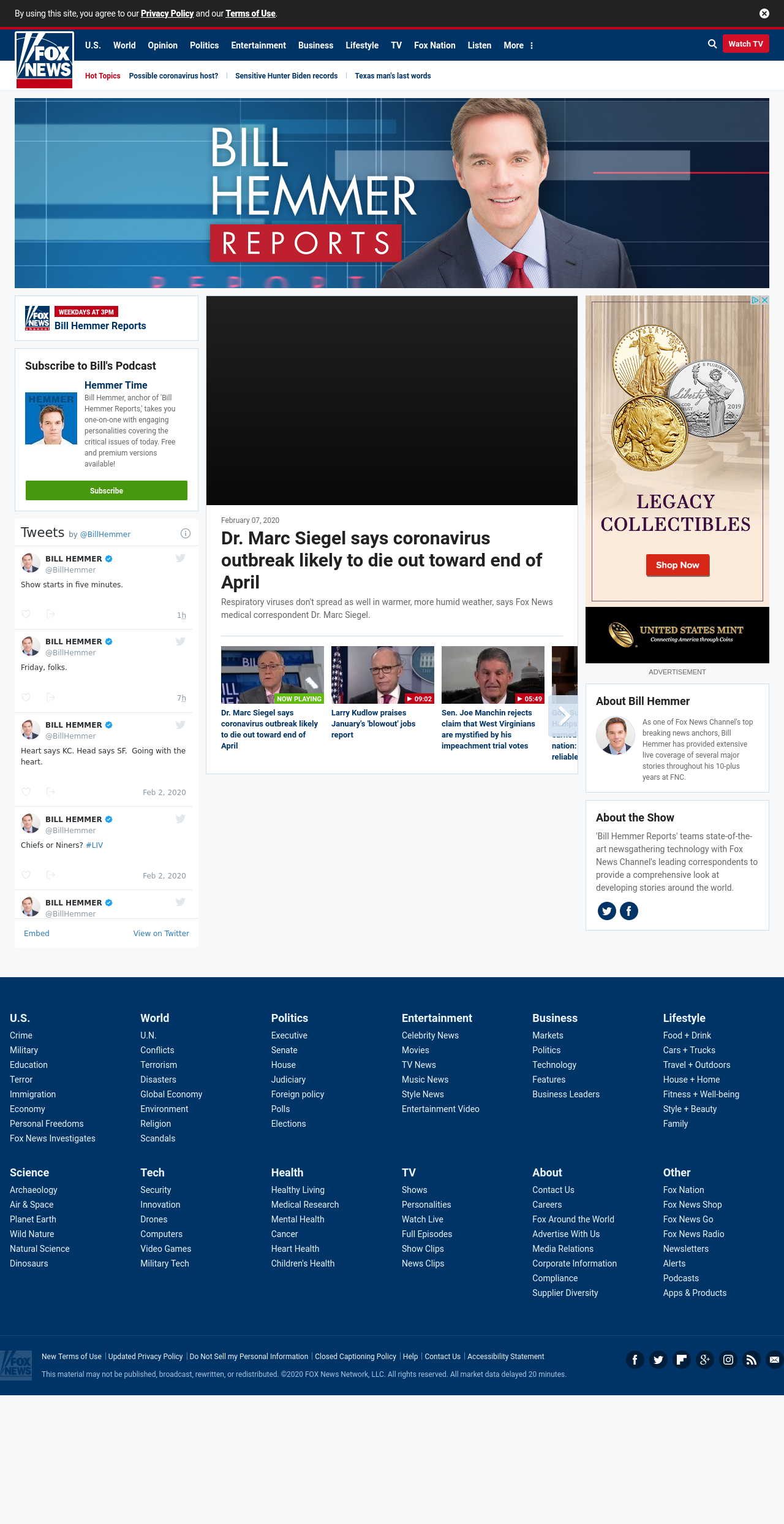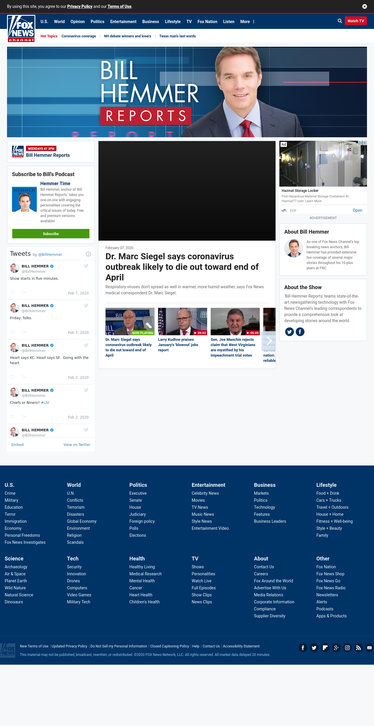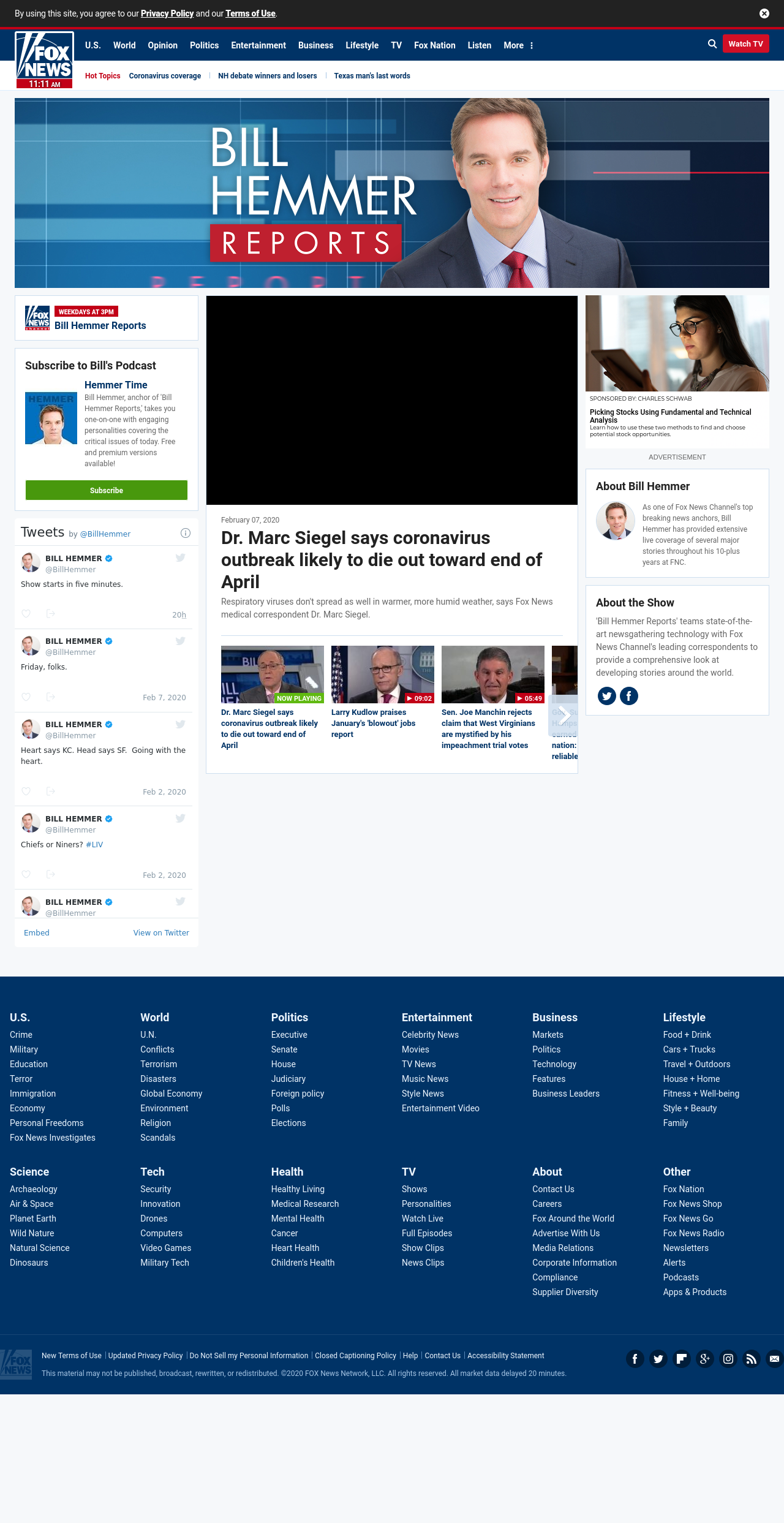 BH: Dr. Marc Siegel says coronavirus outbreak likely to die out toward end of April ((billhemmer________)) ((lubuntu at wor2)) Respiratory viruses don’t spread as well in warmer, more humid weather, says Fox News medical correspondent Dr. Marc Siegel