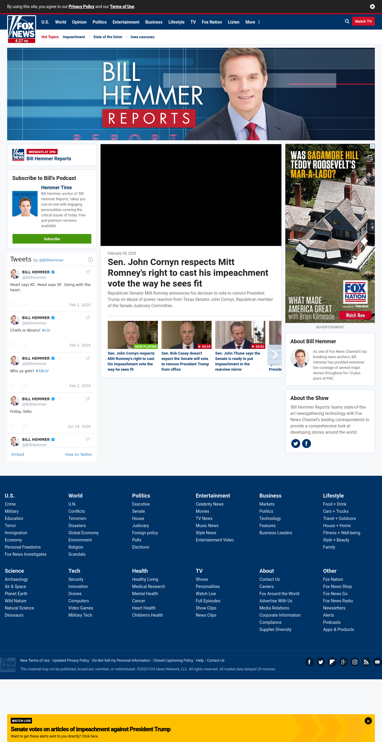 BH: Sen. John Cornyn respects Mitt Romney’s right to cast his impeachment vote the way he sees fit ((billhemmer________)) ((lubuntu at wor2)) Republican Senator Mitt Romney announces his decision to vote to convict President Trump on abuse of power; reaction from Texas Senator John Cornyn, Republican member of the Senate Judiciary Committee