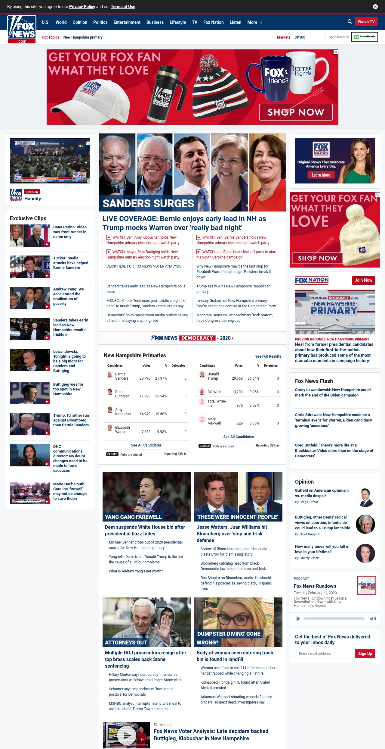FN: [[SANDERS SURGES]] LIVE COVERAGE: Bernie enjoys early lead over Buttigieg, Klobuchar in NH as 2 Dems quit race ((lubuntu at wor2))